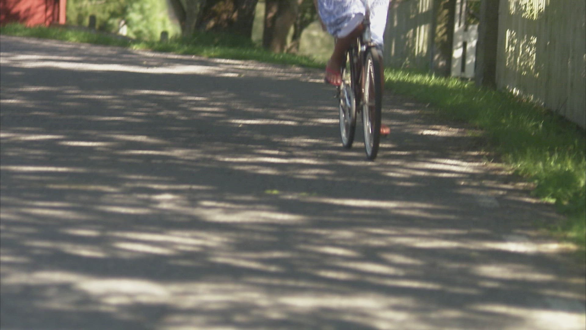 A woman riding a bike in the Swedish countryside.