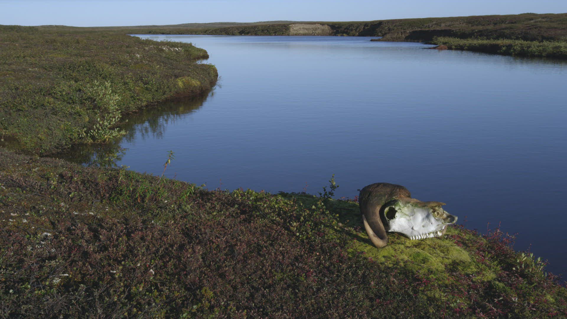 Muskox skull on tundra along riverbank
