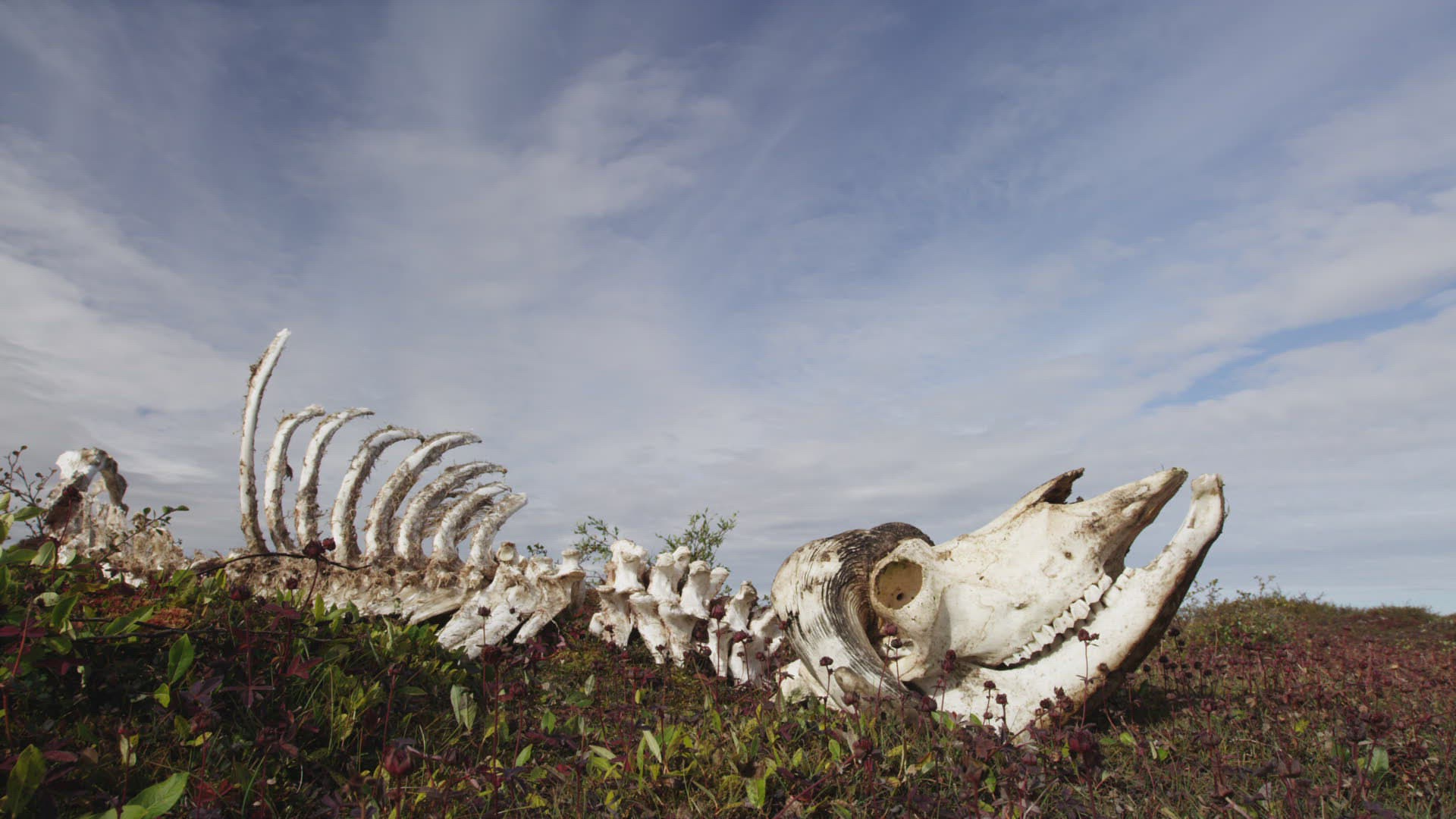 Muskox skeleton lying in autumn tundra along lake near Ungava Bay