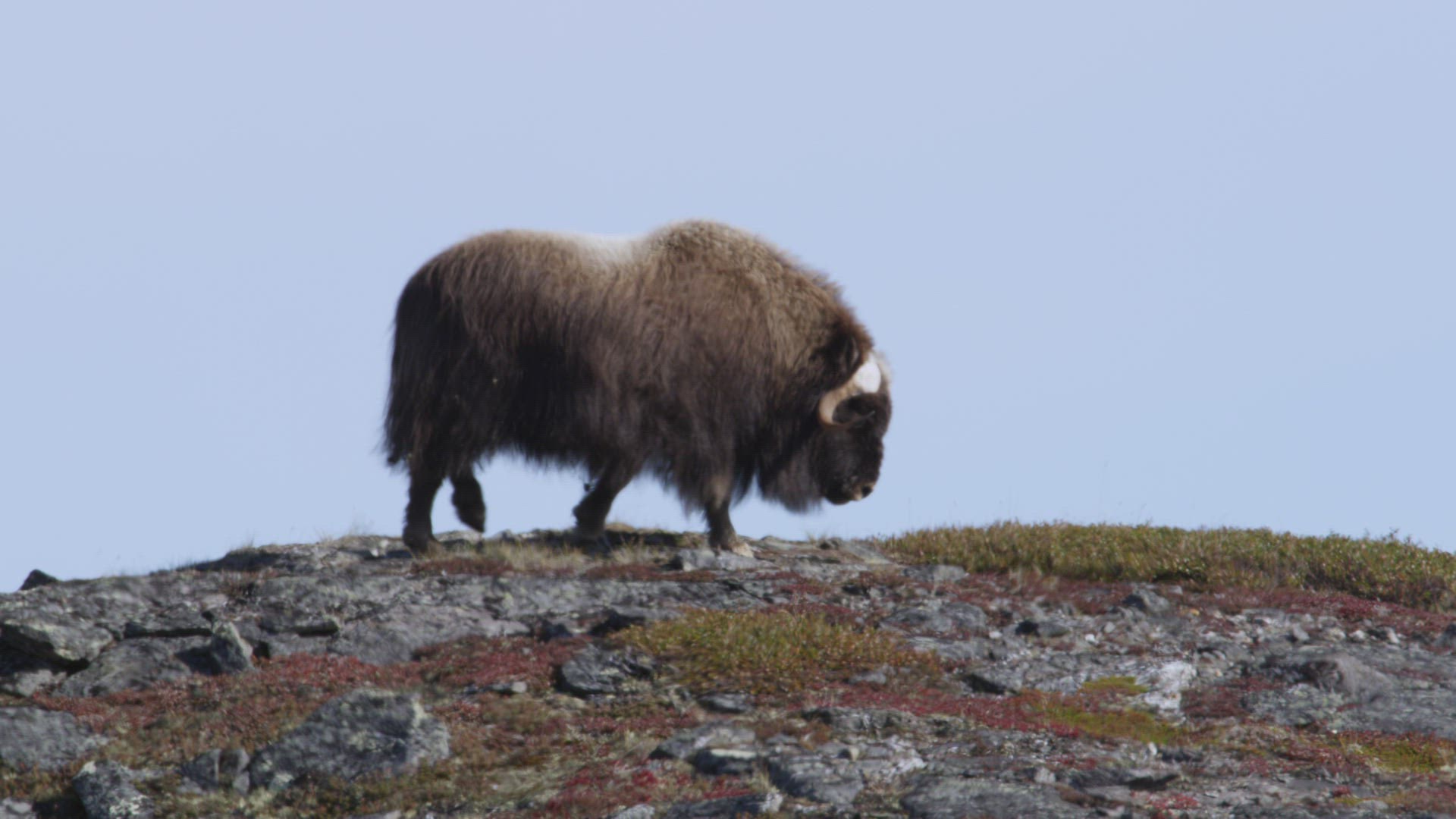 Muskox atop hill lies down