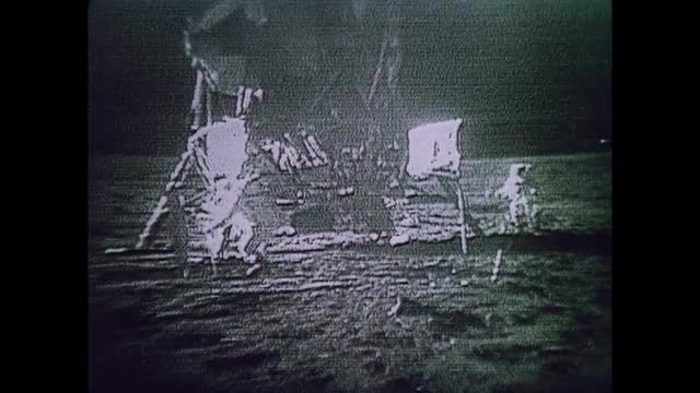 > An astronaut walks on the moon in this re-enactment followed by photos of the moon's surface.