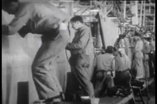 Images celebrate General Motors new wartime plants which make bombs, machine guns and trucks in 1942