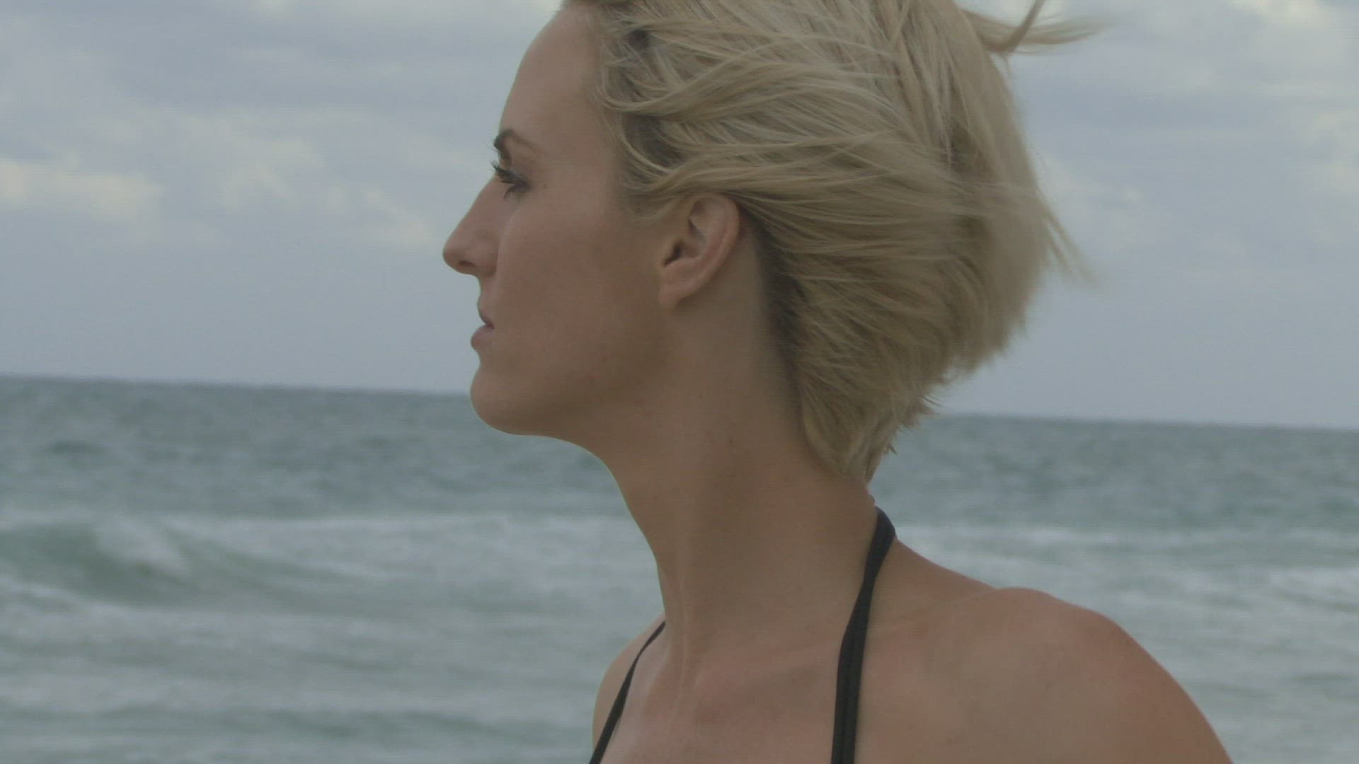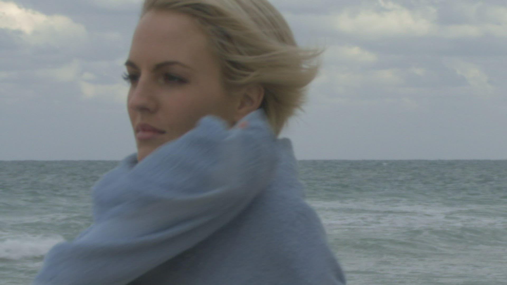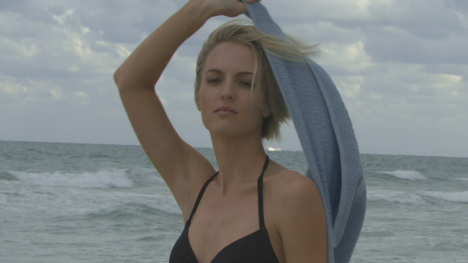 Female wrapping a towel around her on a beach