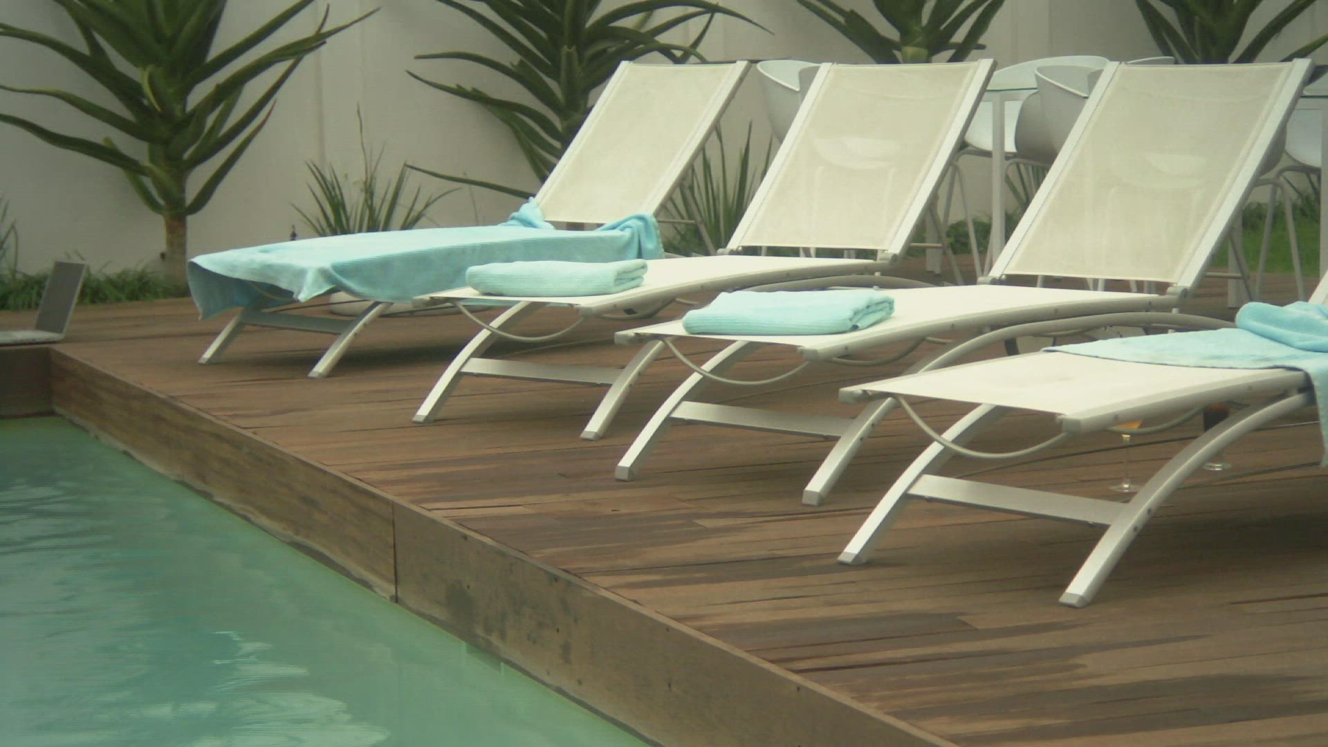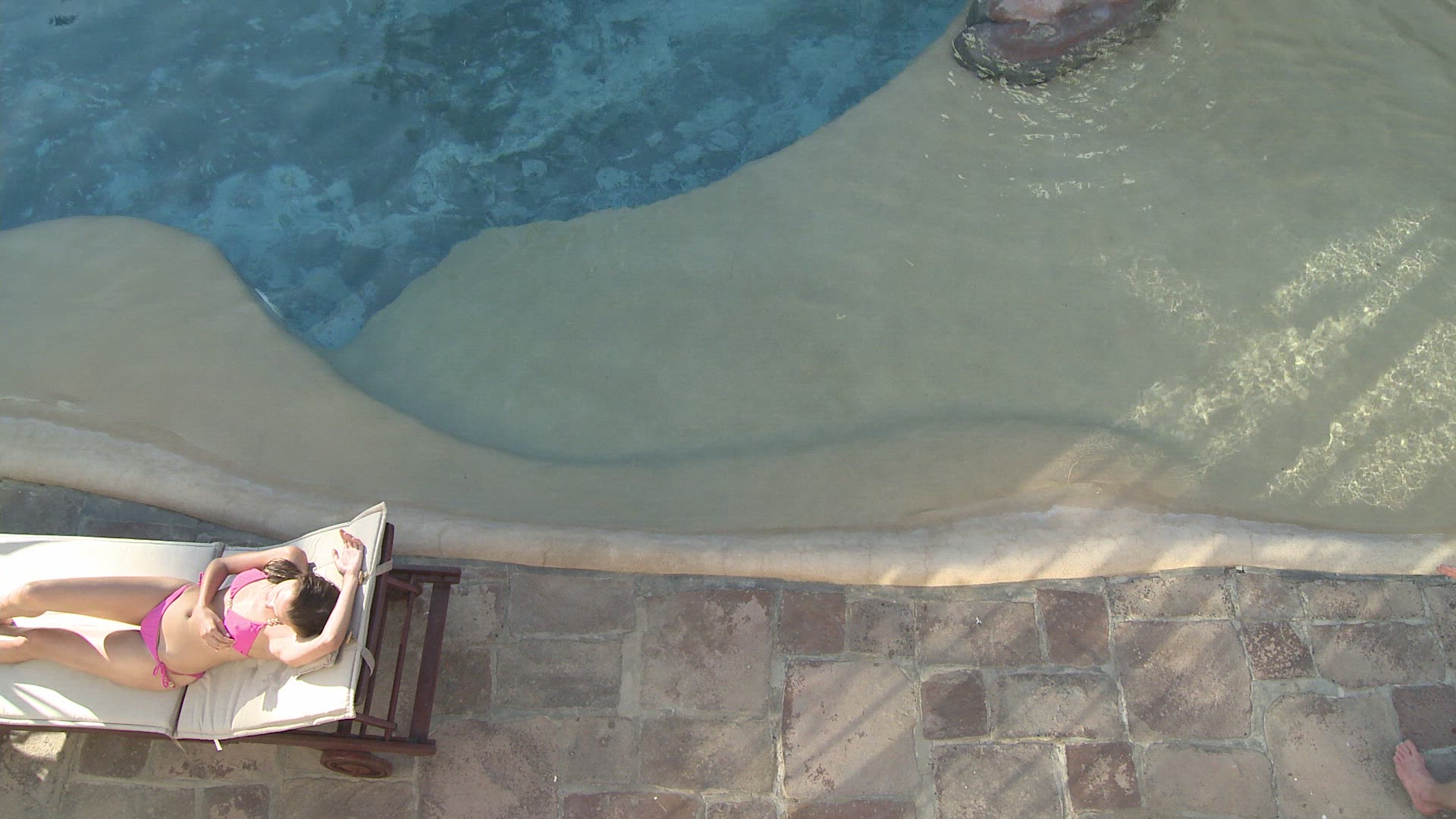 WS PAN OF TWO WOMEN SUNBATHING BY A SWIMMING POOL