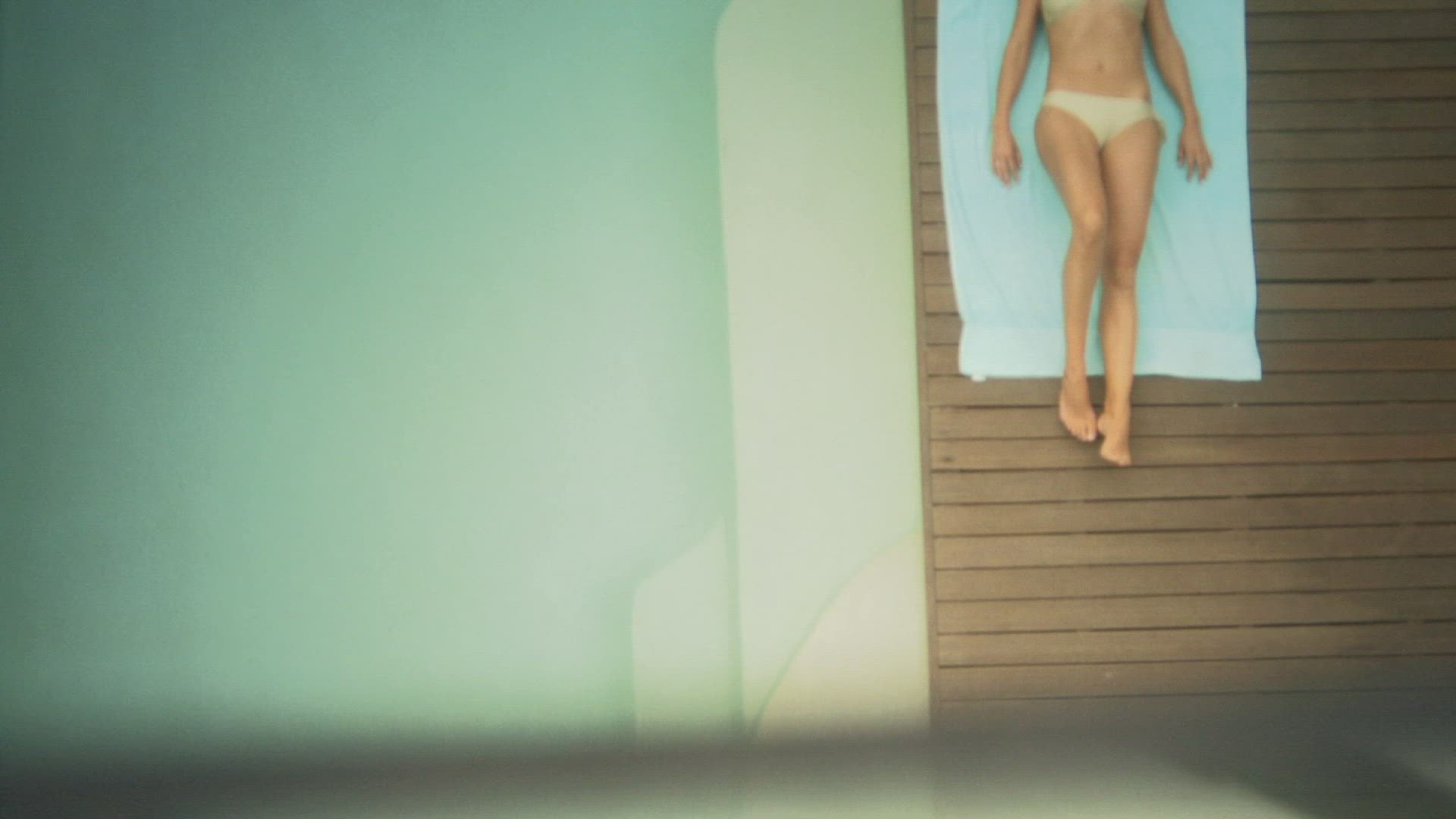 LS PAN OF A YOUNG WOMAN SUNBATHING NEXT TO SWIMMING POOL