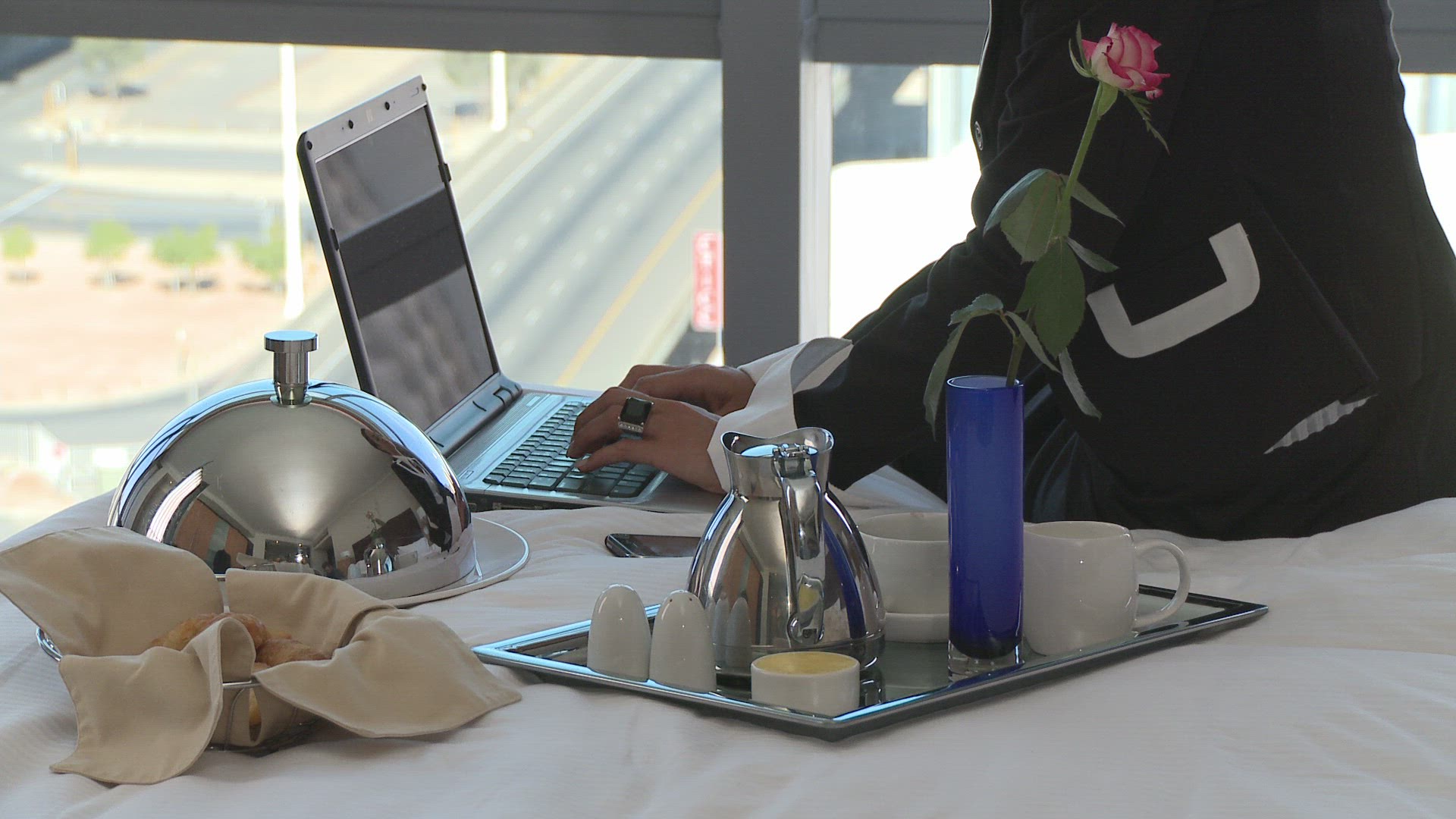 MS PAN OF A BUSINESSWOMAN ANSWERING HER CELL PHONE IN HER HOTEL ROOM