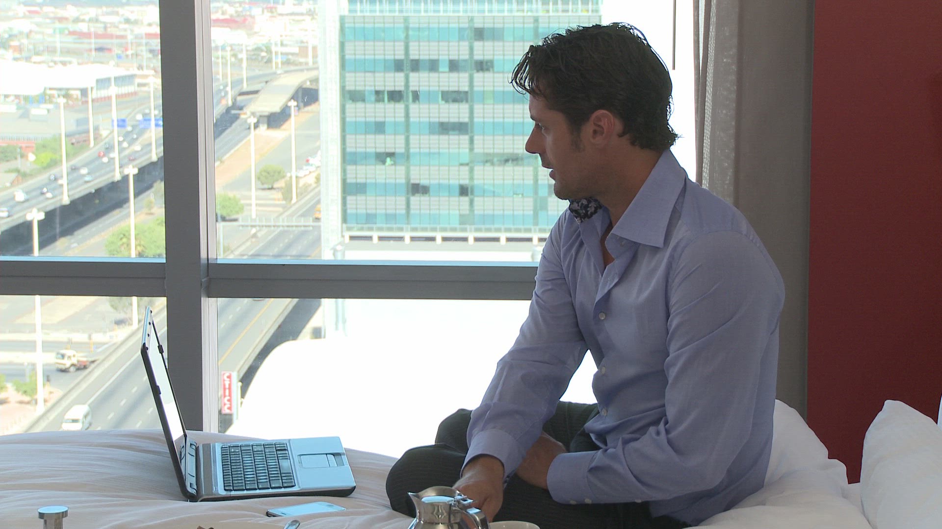 LS PAN OF A BUSINESSMAN WORKING ON HIS LAPTOP IN HIS HOTEL ROOM