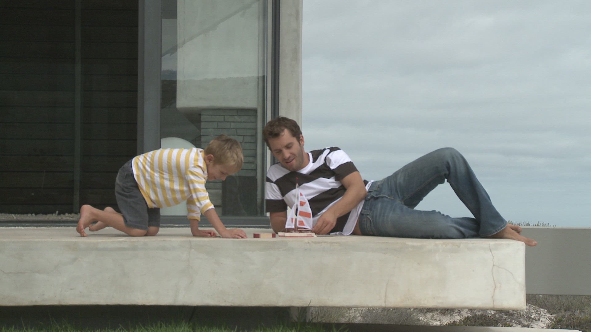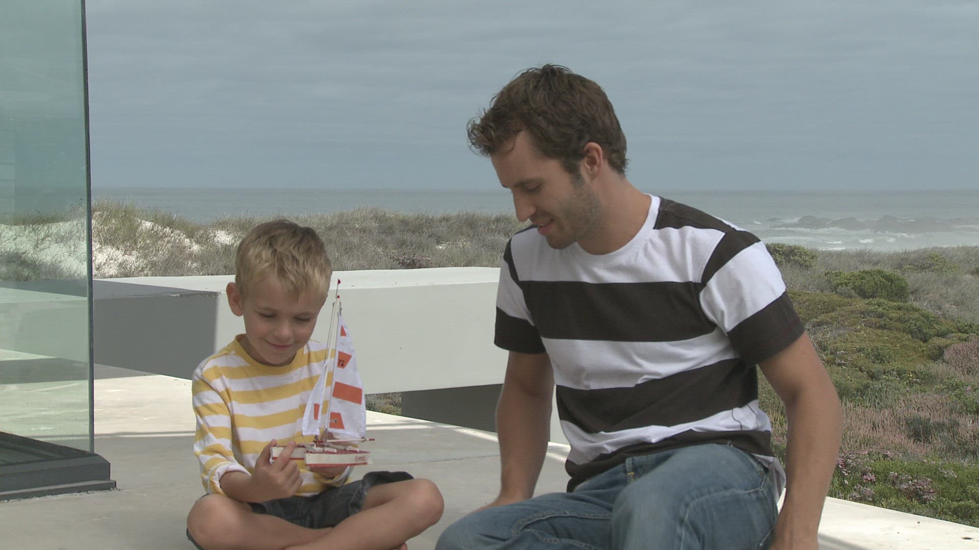 WS OF A FATHER AND SON PLAYING WITH A TOY BOAT