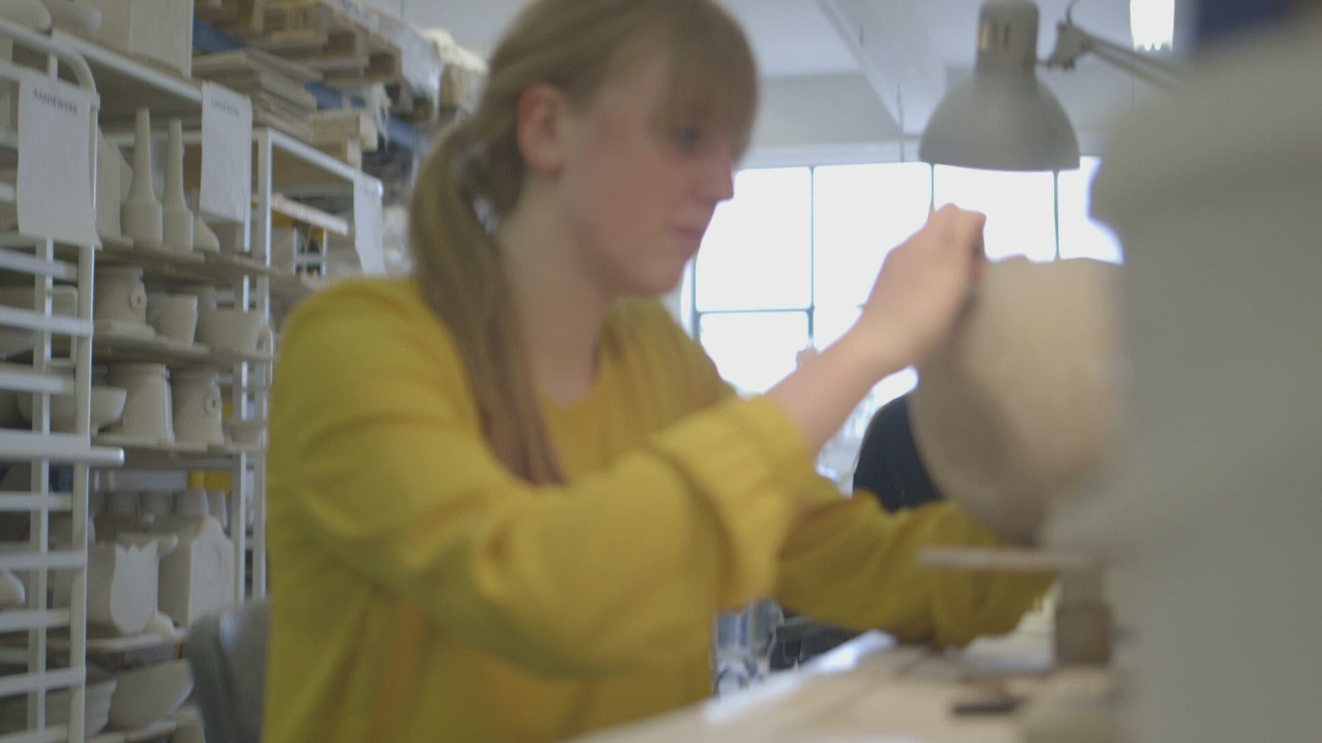 Young female artist carving crafts product in workshop