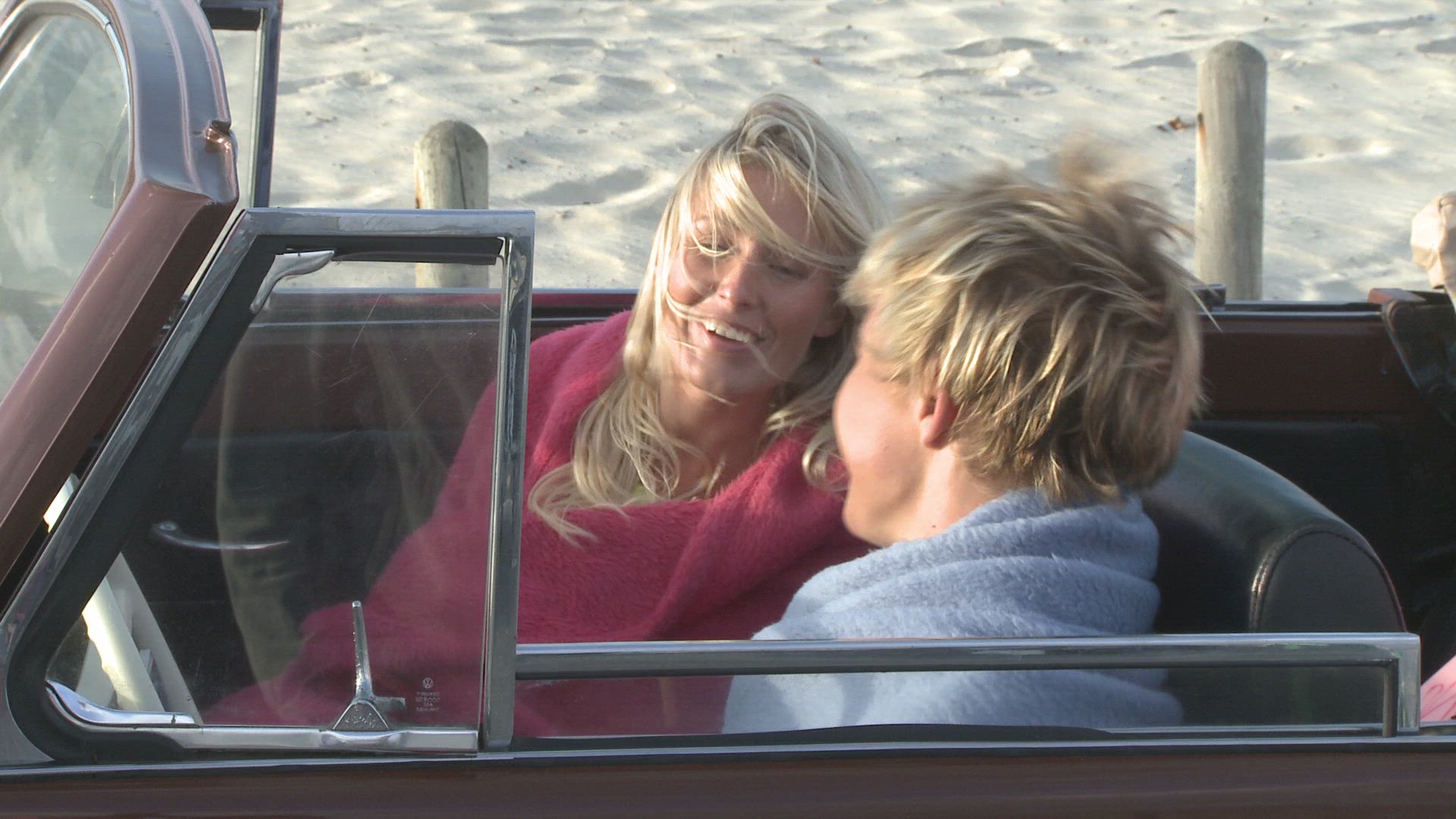 MCU PAN OF A YOUNG WOMAN WRAPPED IN A BLANKET NEXT TO A CAR