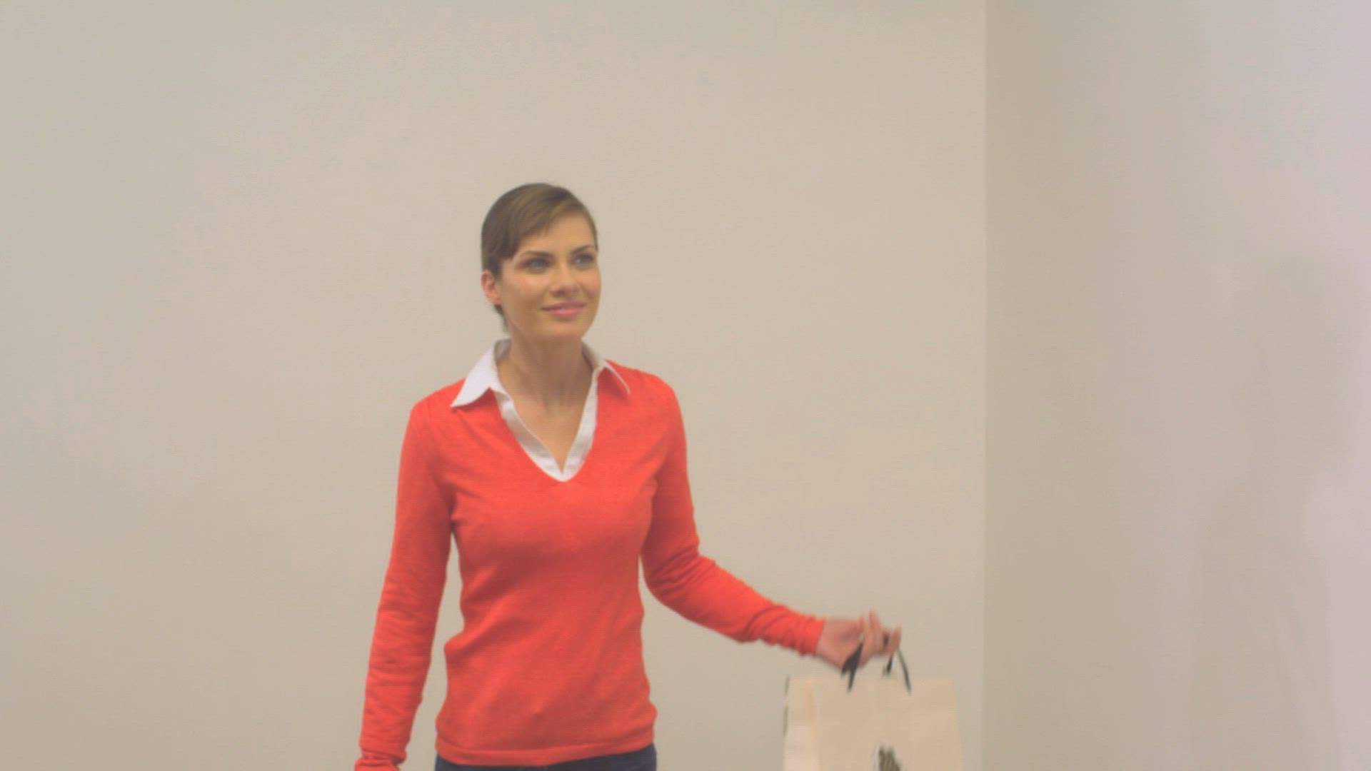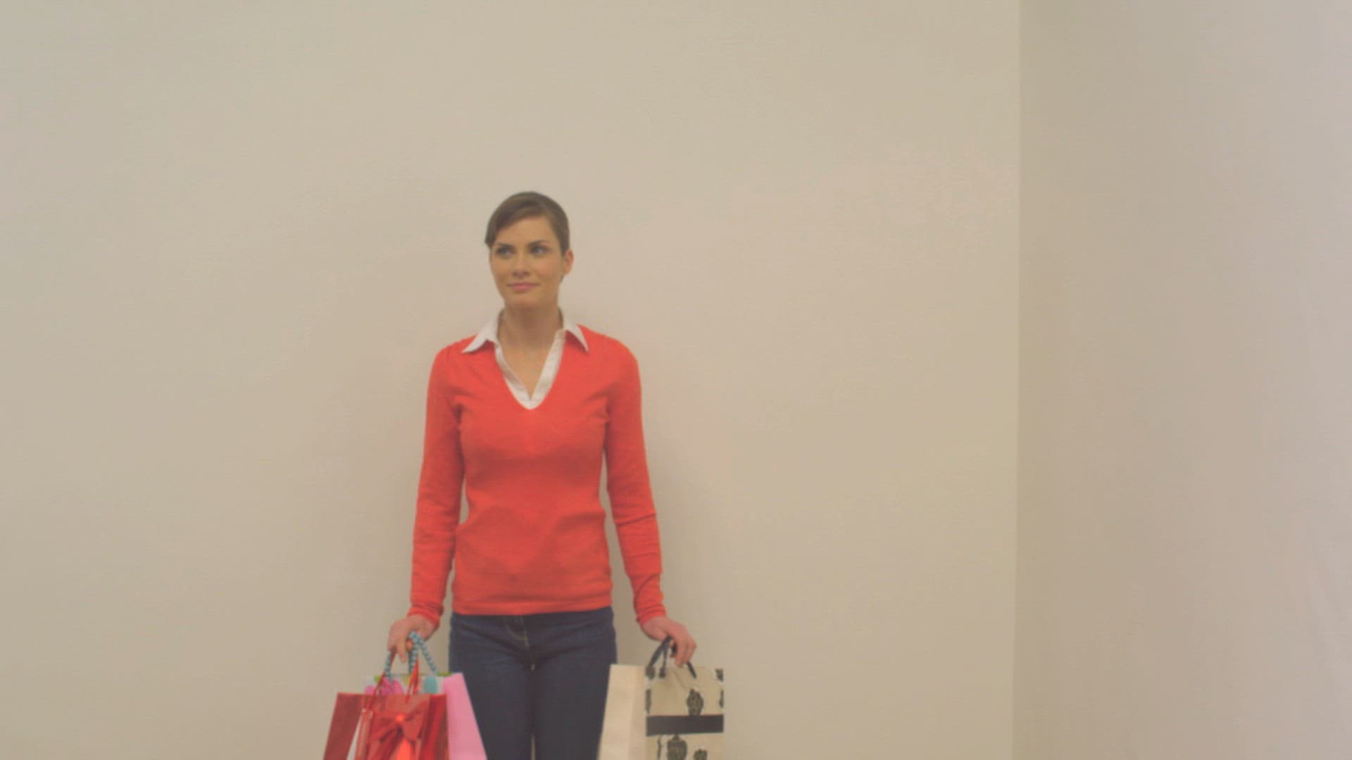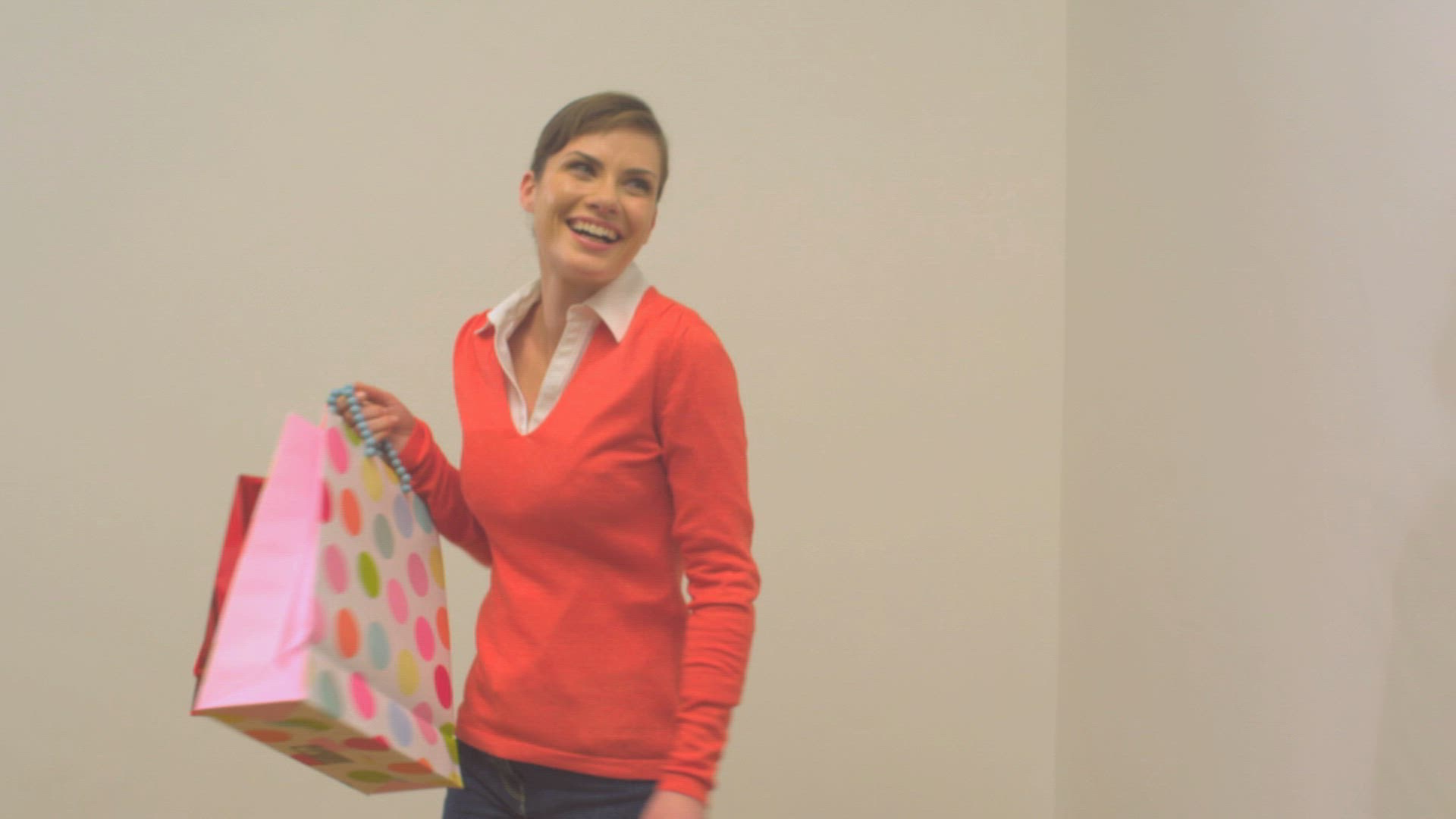 MS OF AN EXCITED WOMAN LIFTING SHOPPING BAGS