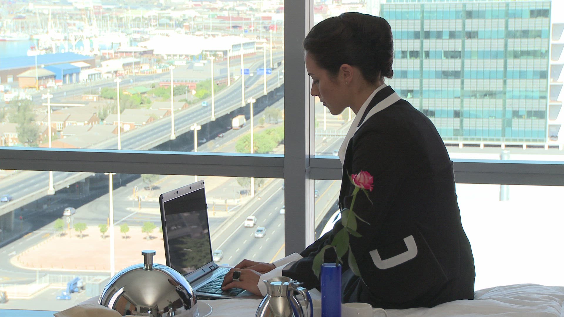 MCU PAN OF A WOMAN USING A CELL PHONE