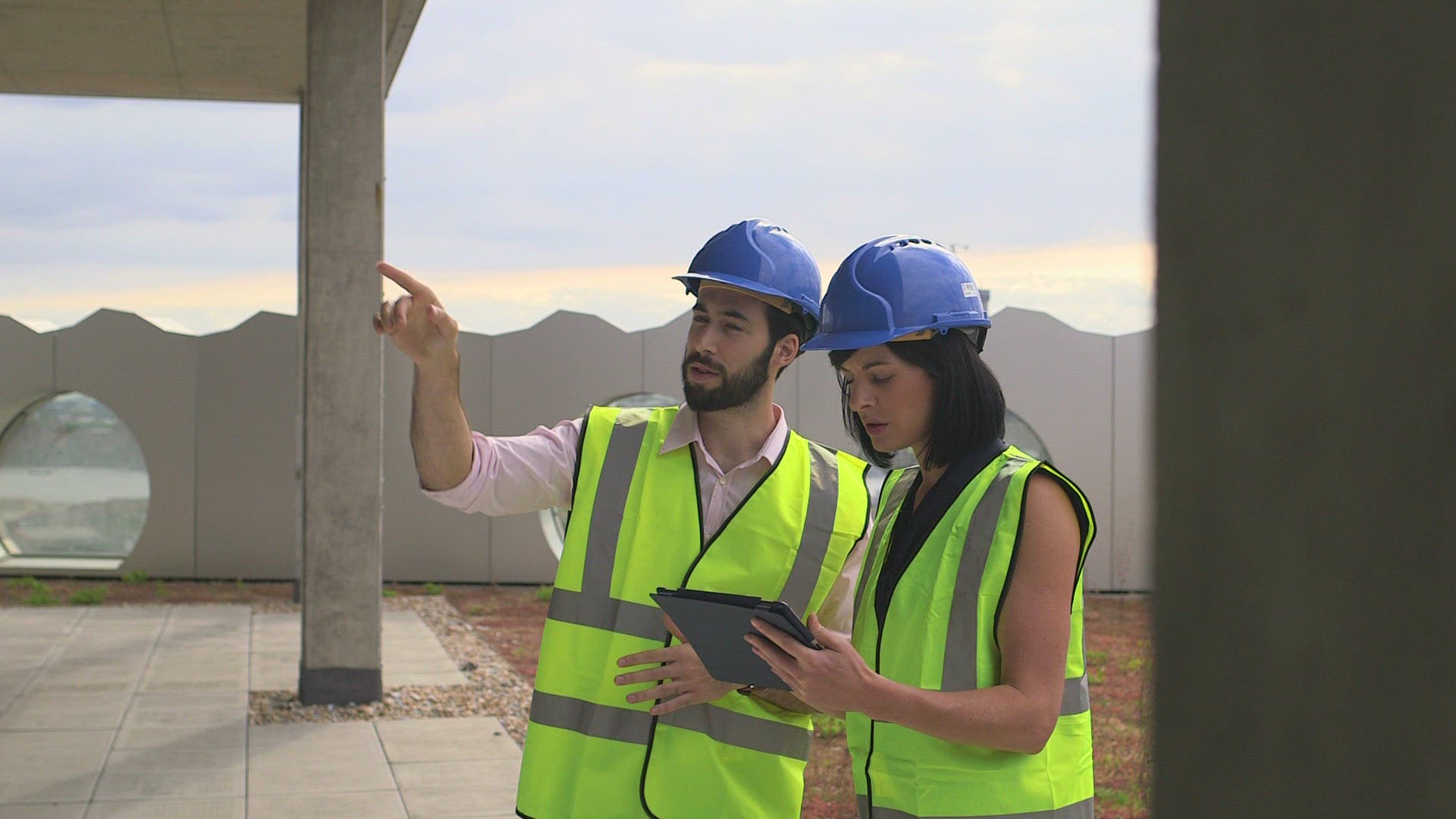 Man and woman discussing with digital tablet at construction site