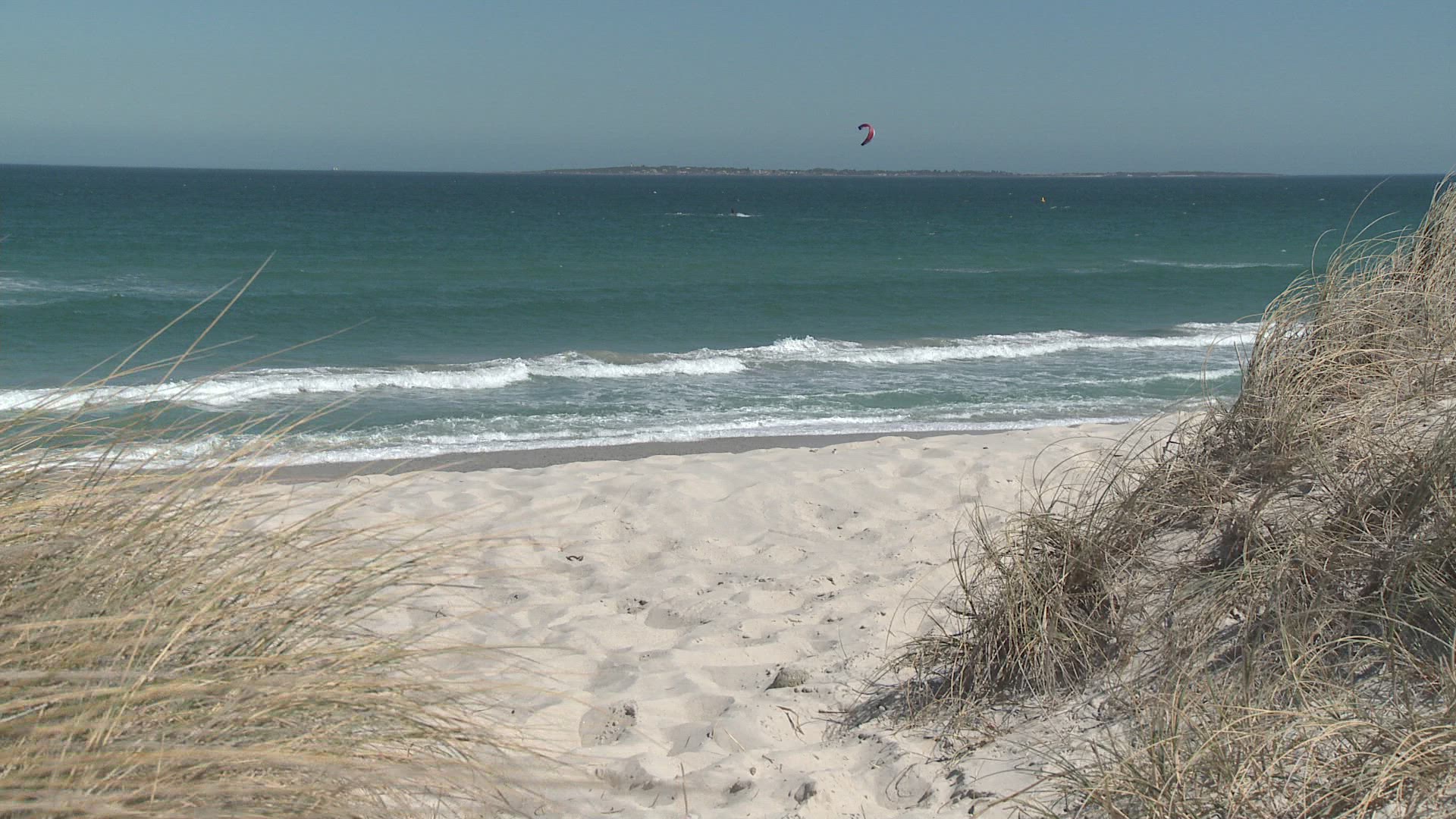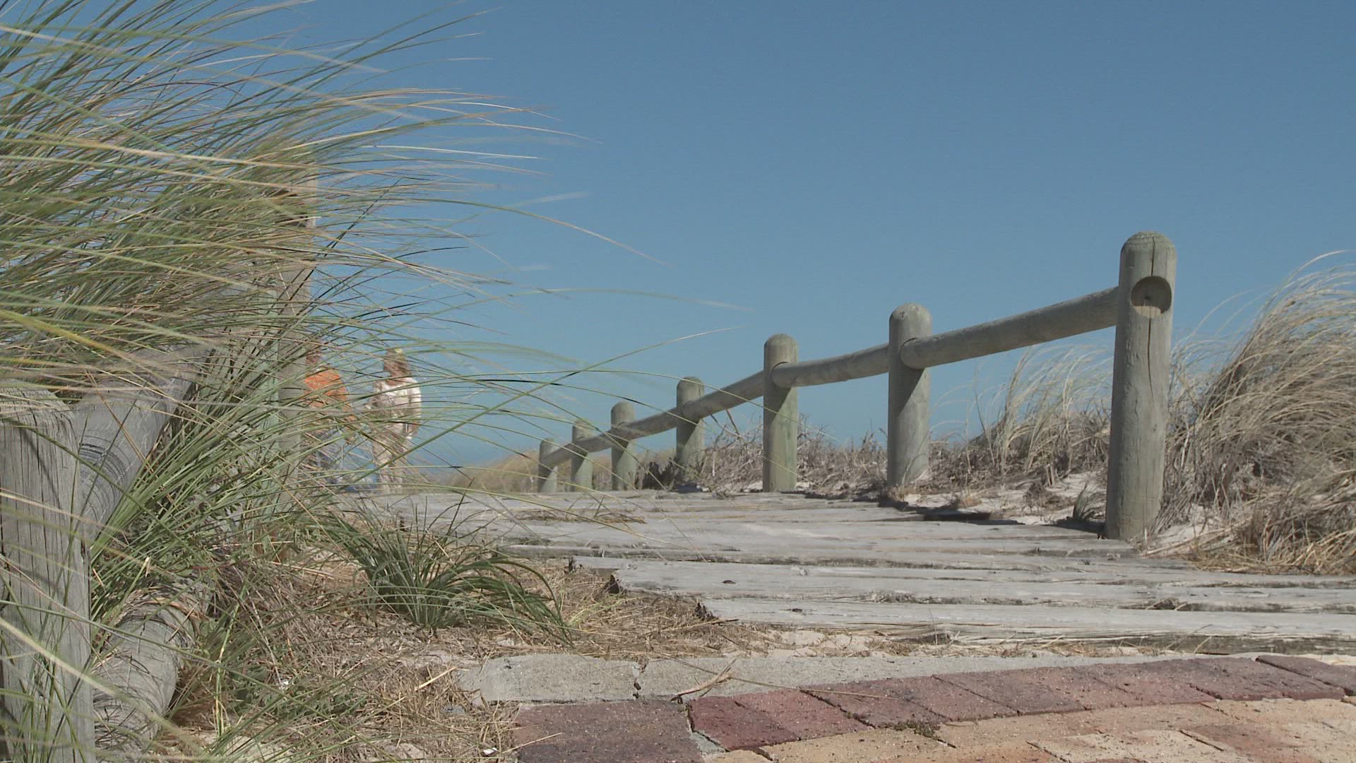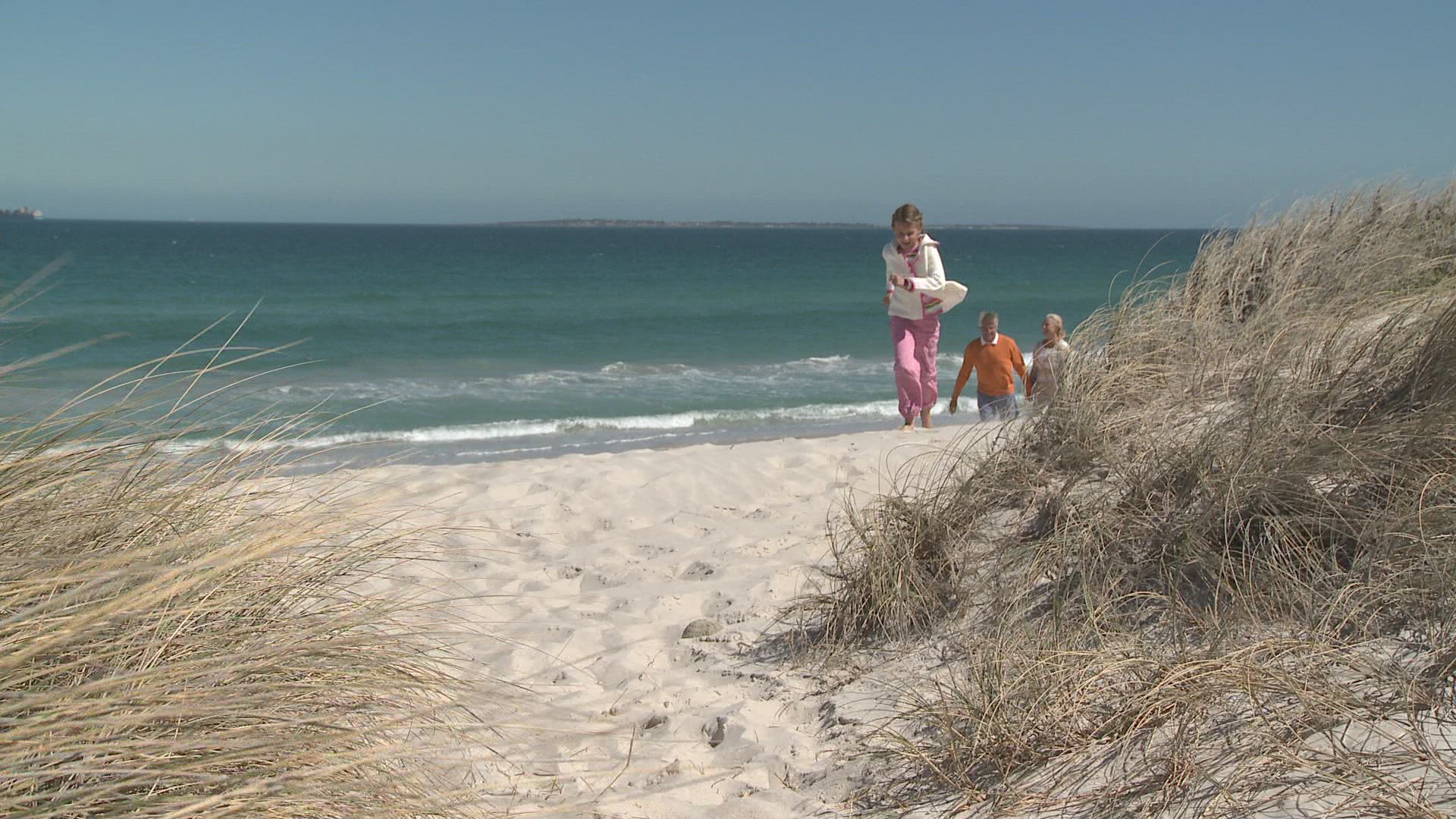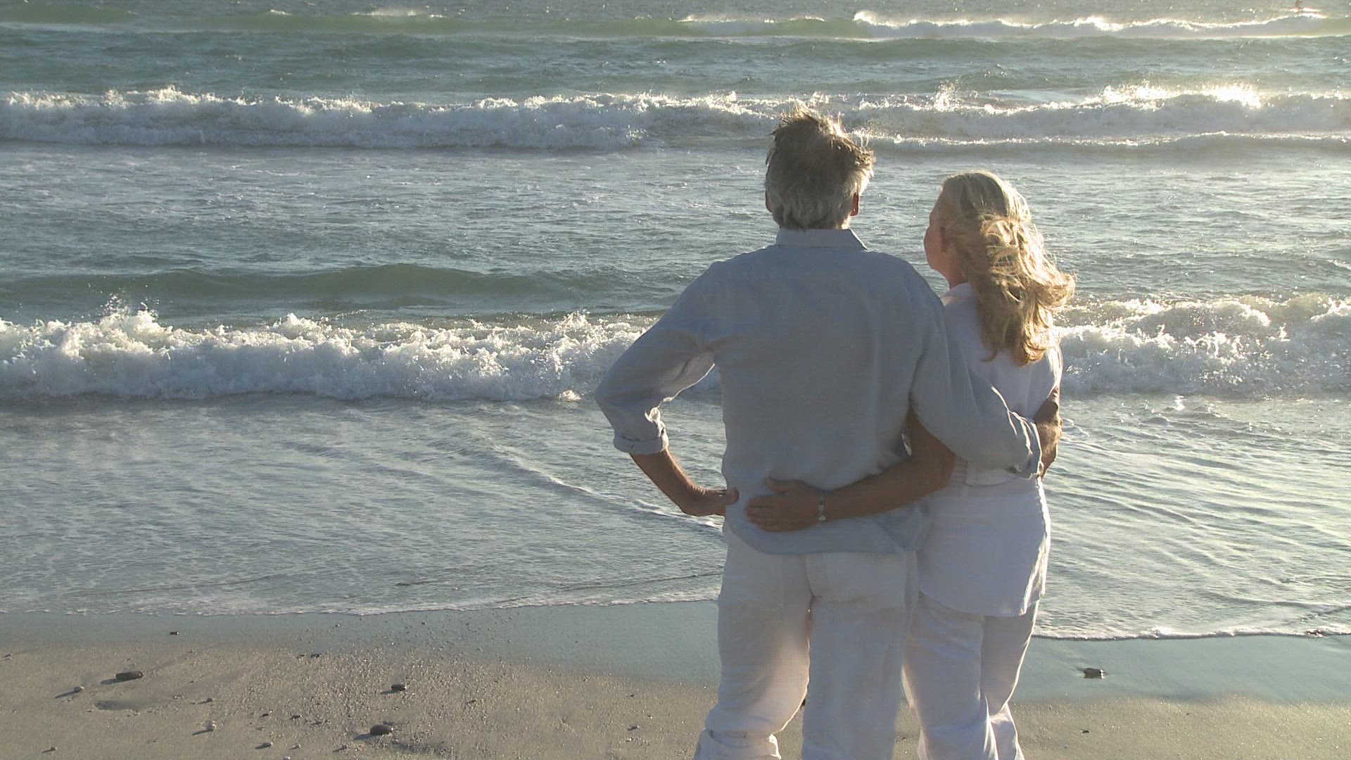 LS PAN OF A SENIOR COUPLE WALKING ALONG A BEACH