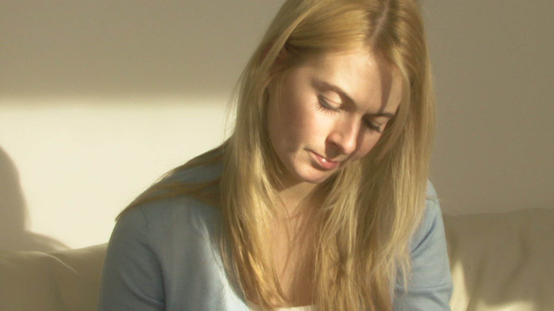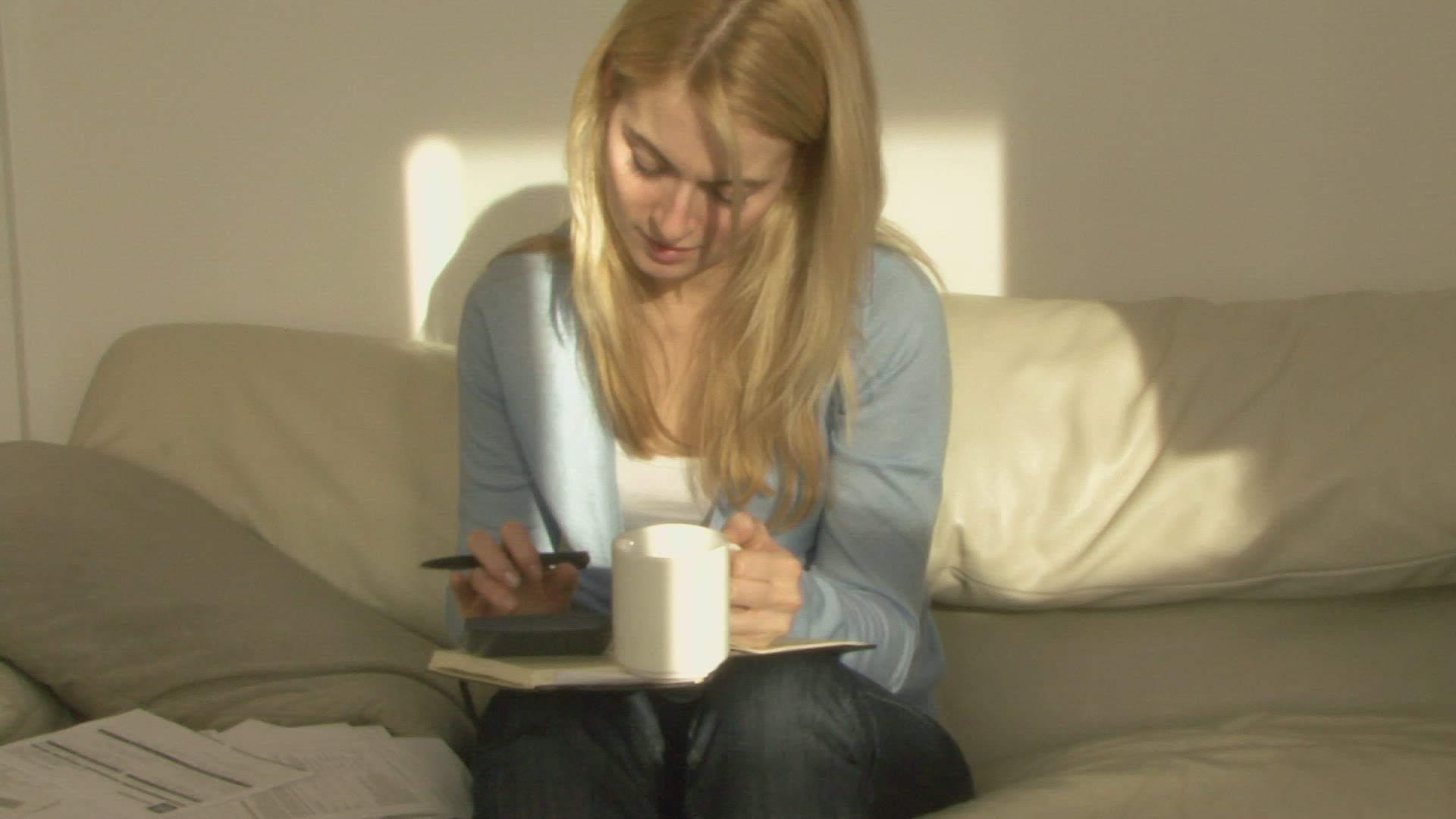WS OF YOUNG WOMAN SAT AT TABLE WRITING