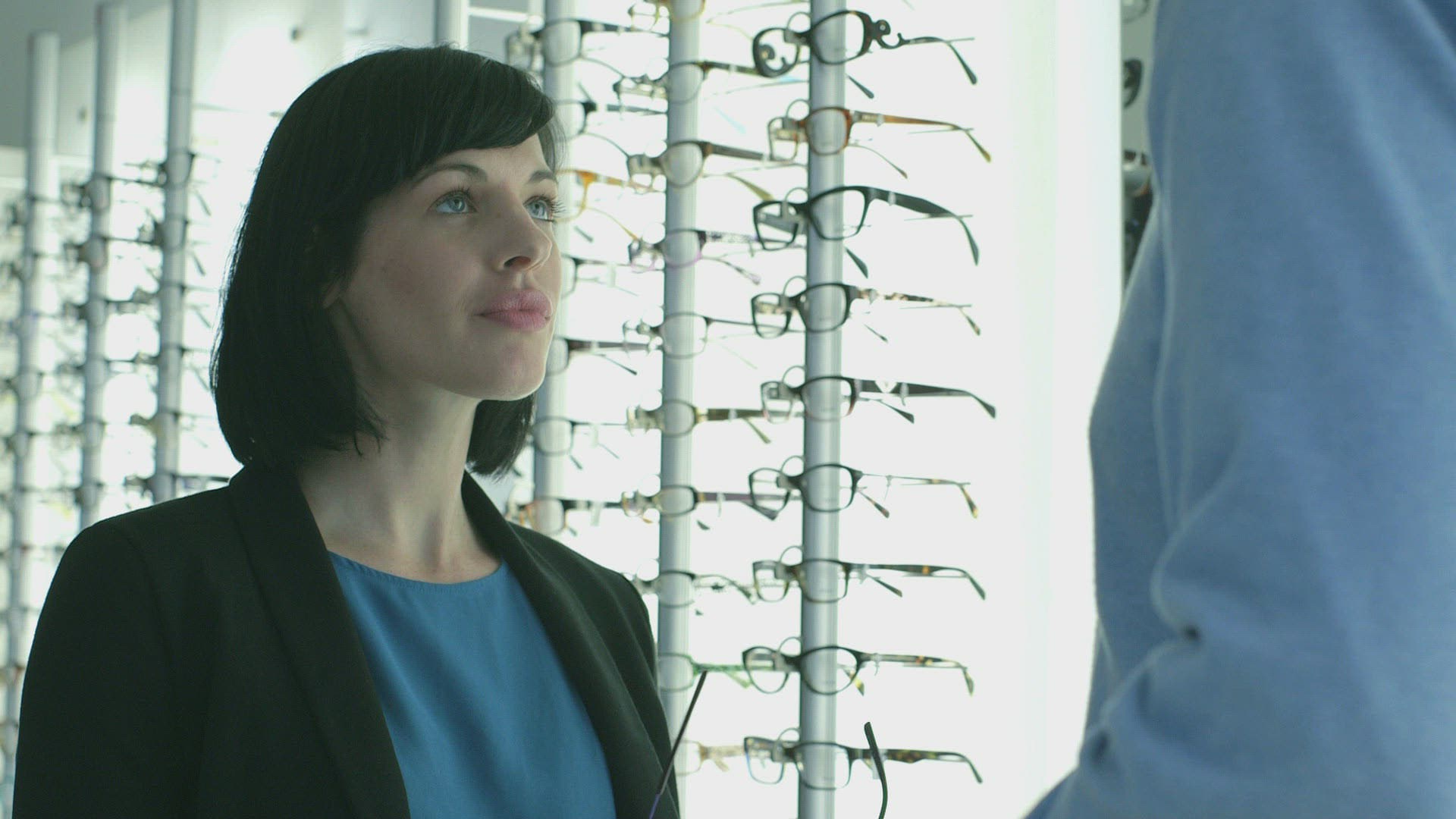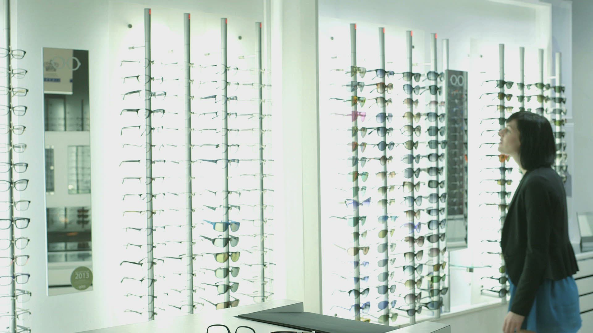 Female customer browses Optician shop and selects glasses to try on