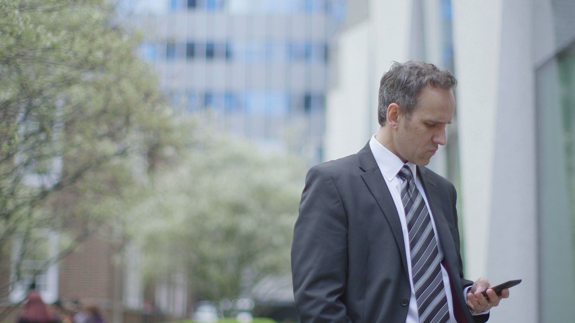 Business Man receives a call outside the office and as he talks a Business woman walks by
