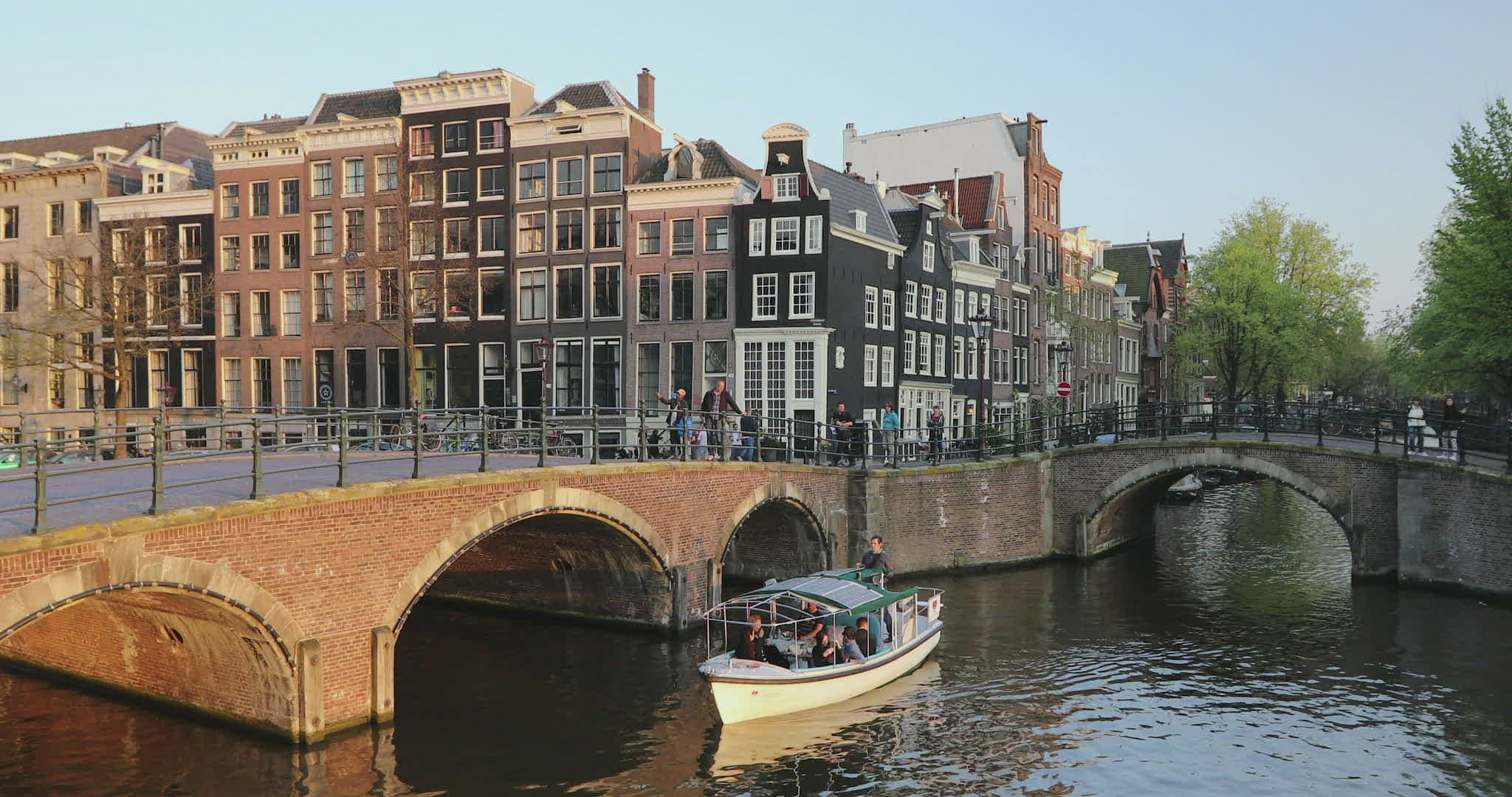 Female cycling over bridge in amsterdam with flowers
