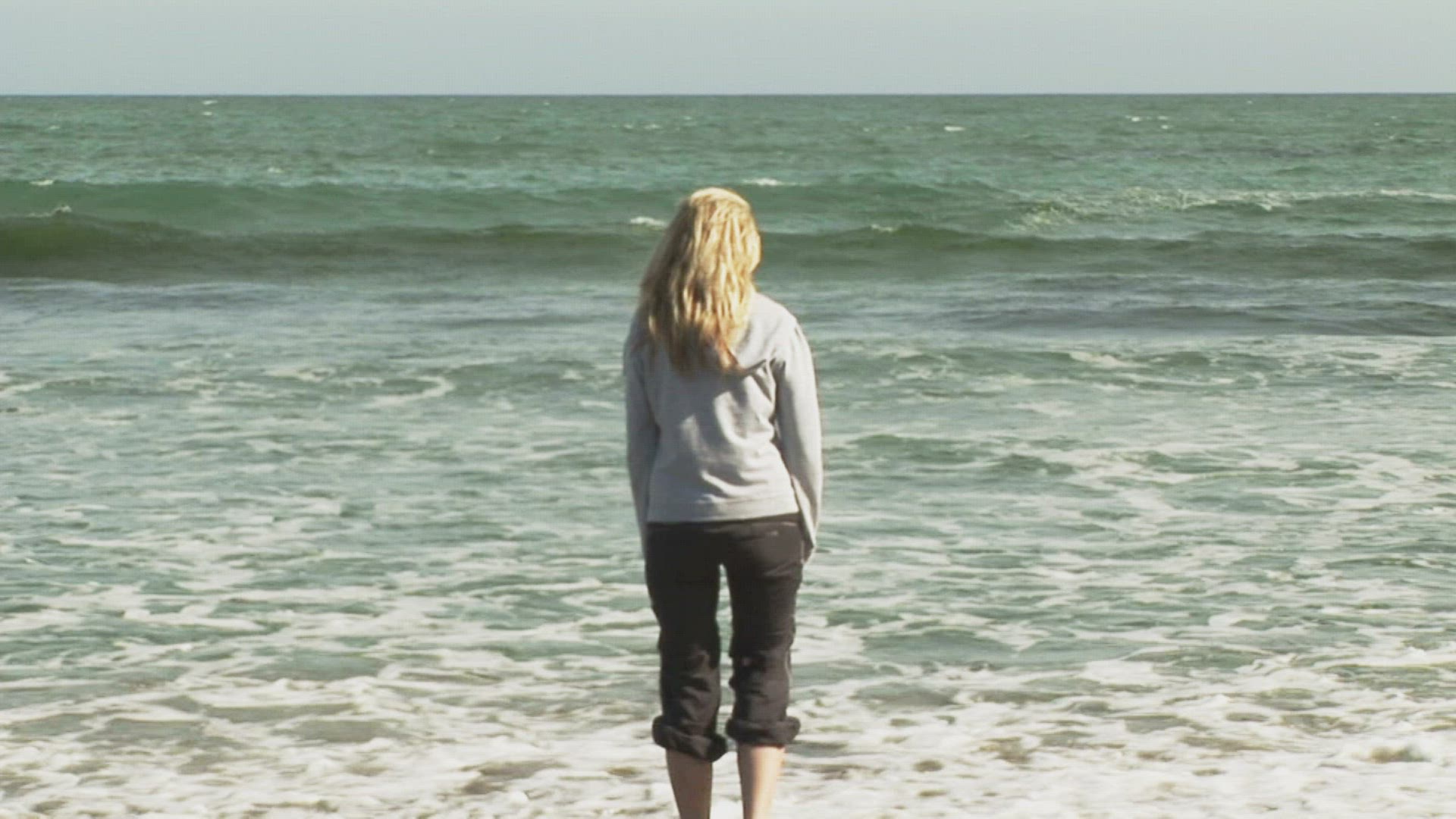 WS FOCUS SHIFT REAR VIEW OF A YOUNG WOMAN RUNNING TO THE SEA