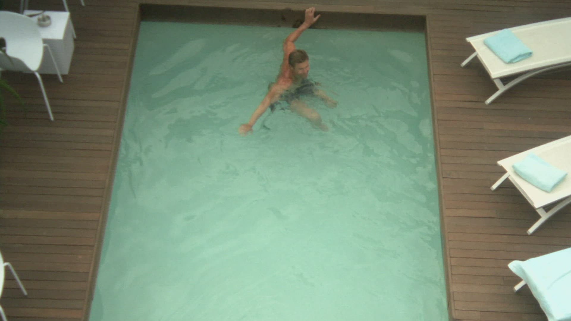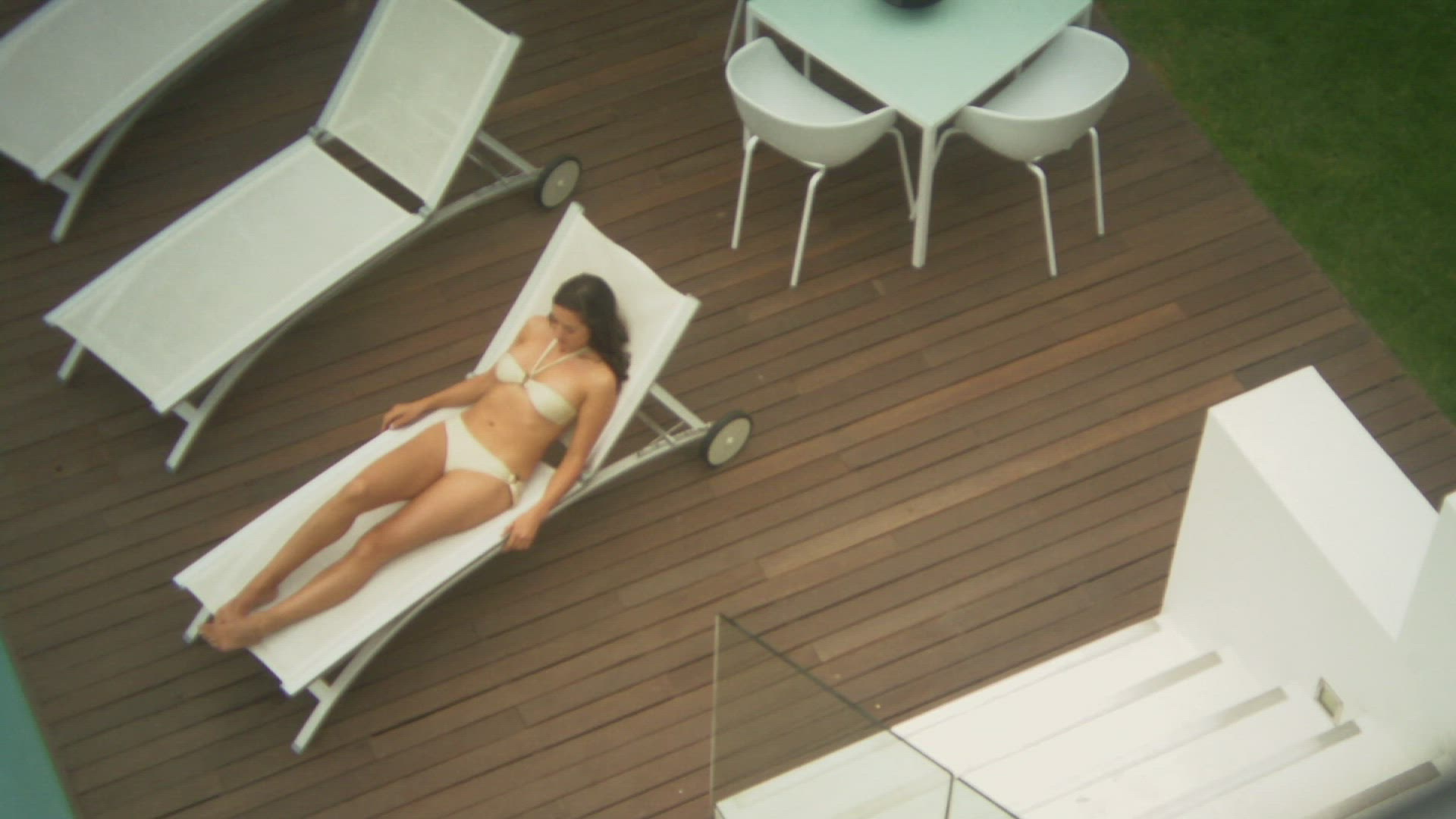 LS PAN OF A WOMAN WALKING DOWN STEPS AND LYING ON A SUN LOUNGER