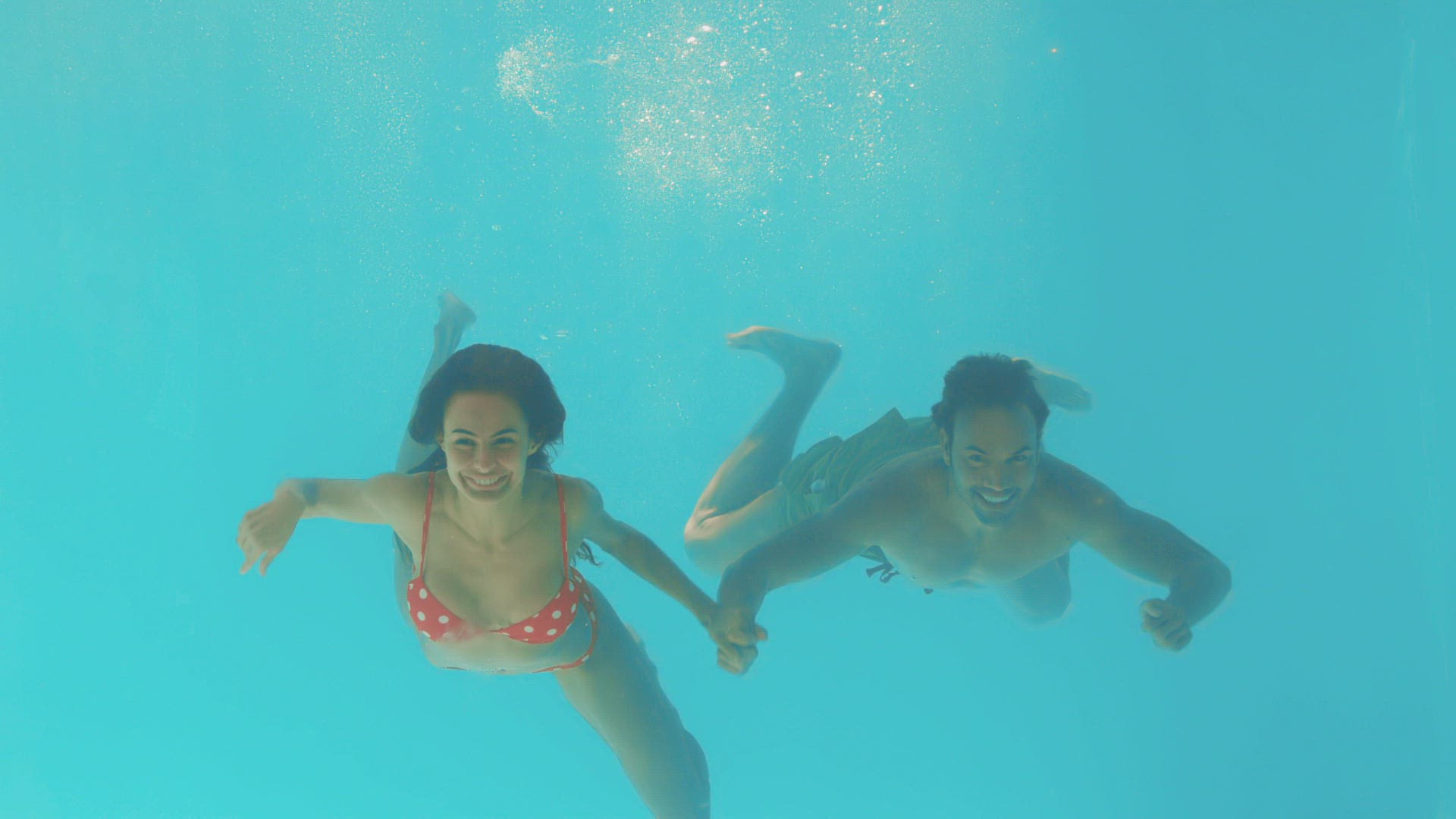 LS PAN OF A MAN AND WOMAN TALKING BY A POOL