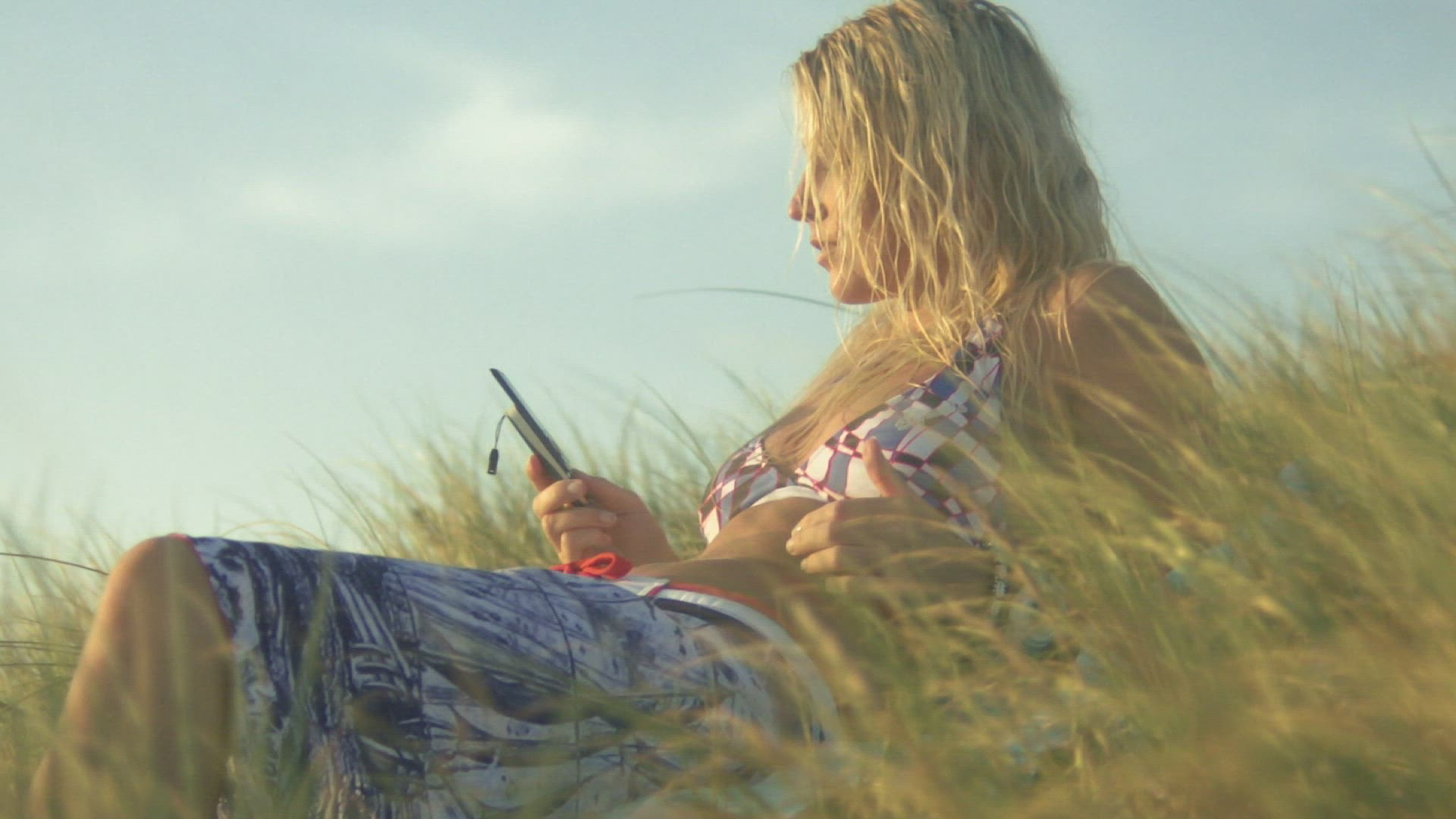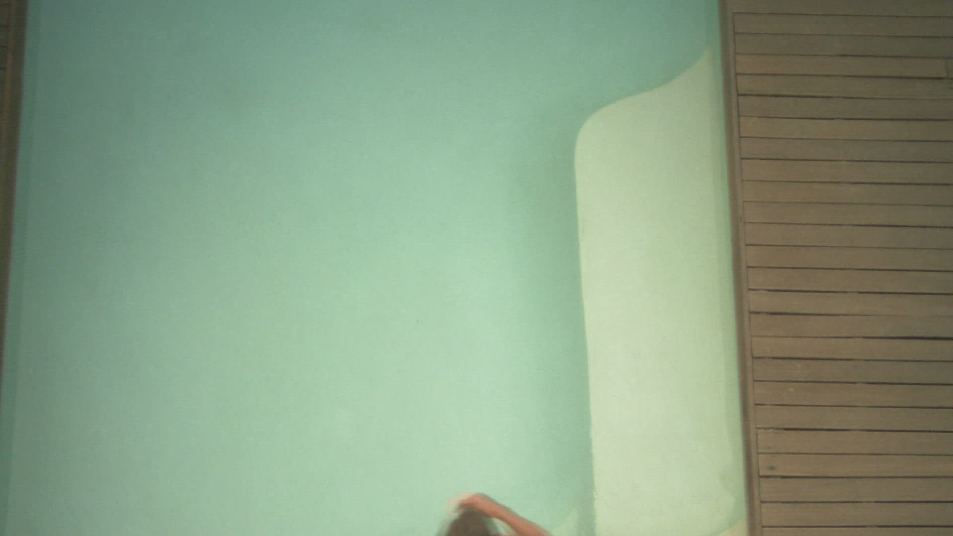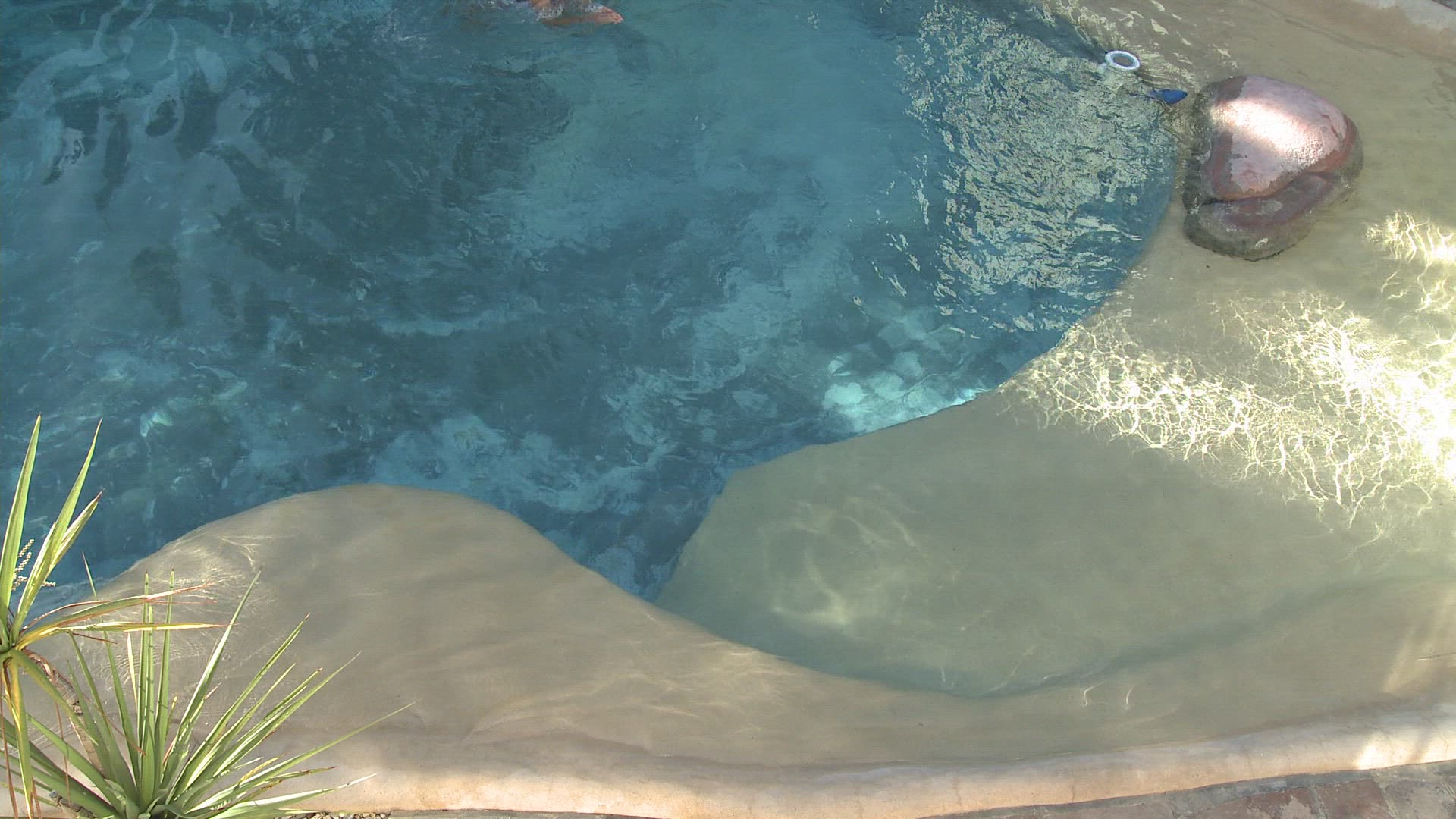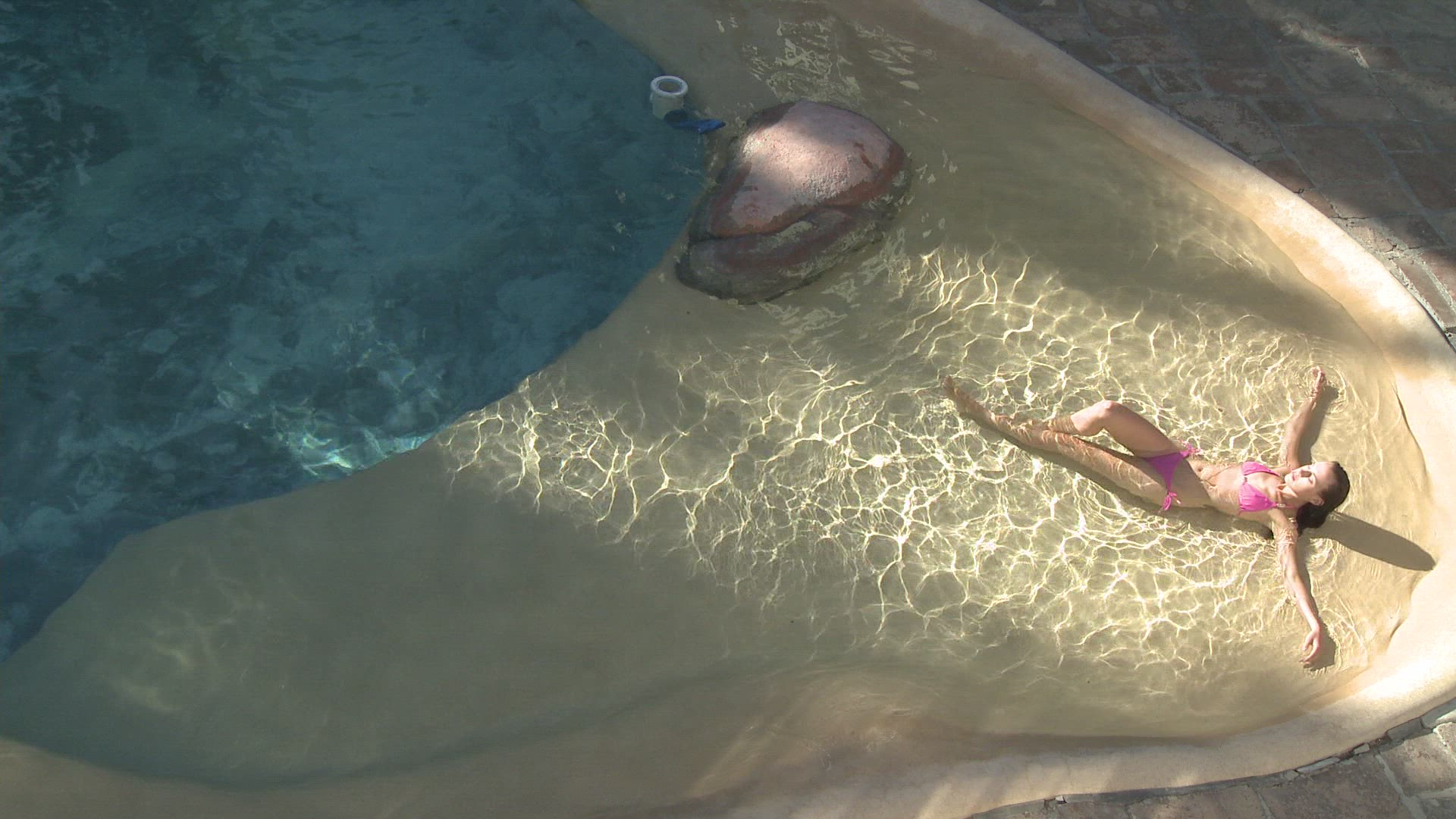 LS PAN OF A WOMAN WALKING DOWN STEPS AND LYING ON A SUN LOUNGER WITH A MAN SWIMMING IN A POOL