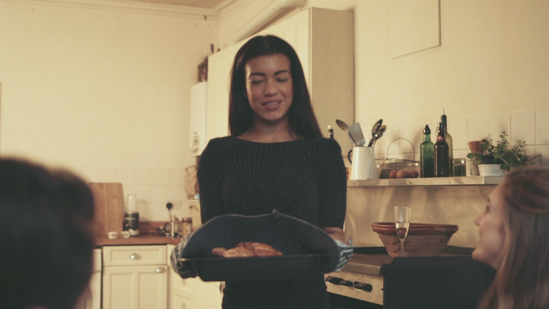 Young woman removing roasted turkey from kitchen oven for thanksgiving party