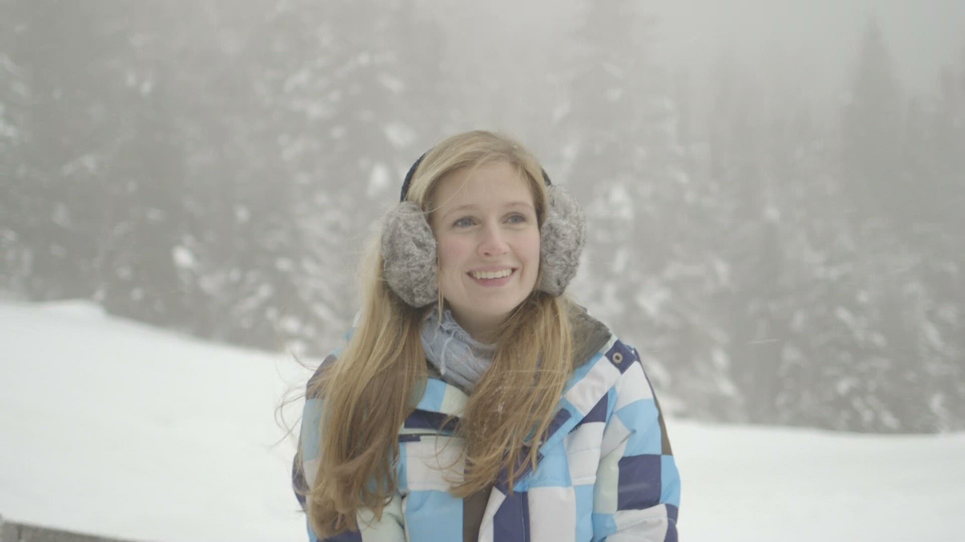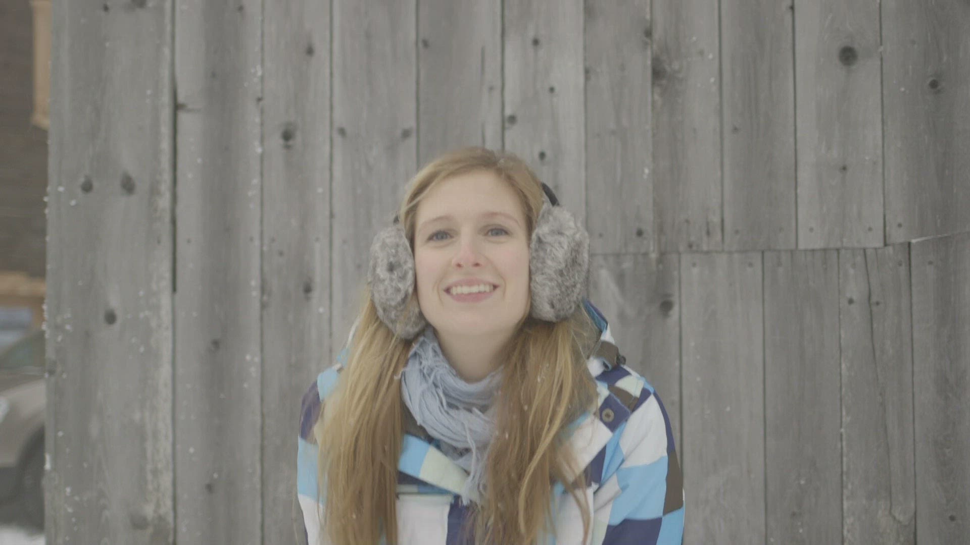 Close up Young woman wearing earmuffs and enjoying in snow
