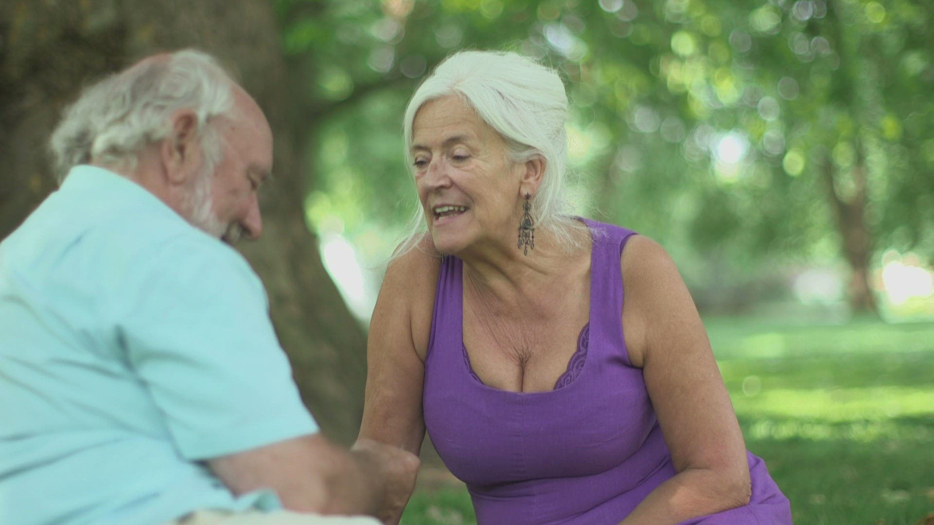 Senior couple sitting in park and talking; London; UK