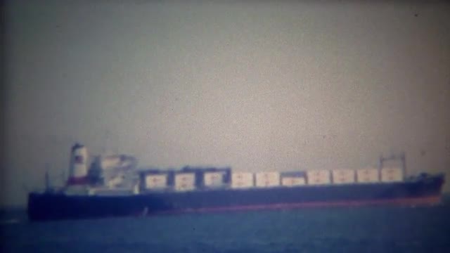 490724 - 1956: Full cargo container ship heading out to open ocean water.