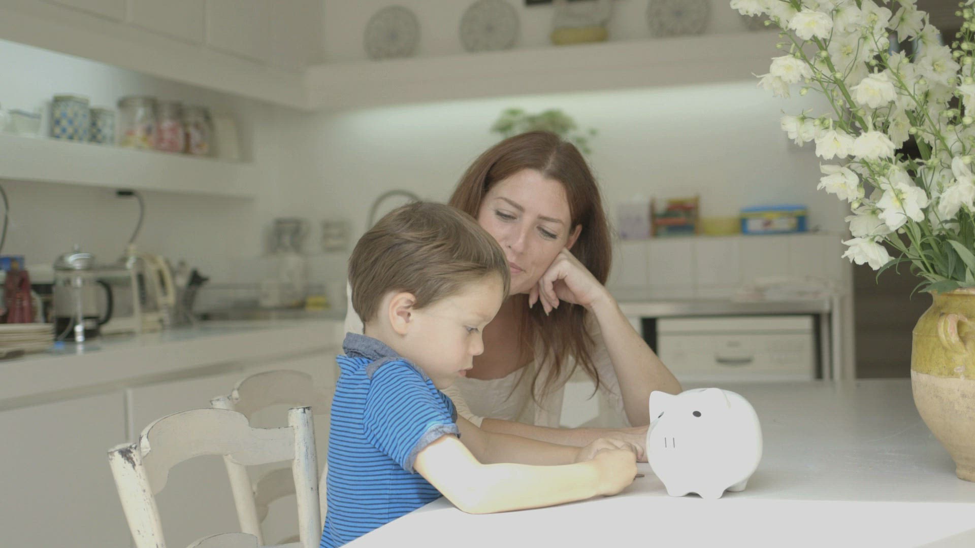 Father helping son to save money in piggy bank