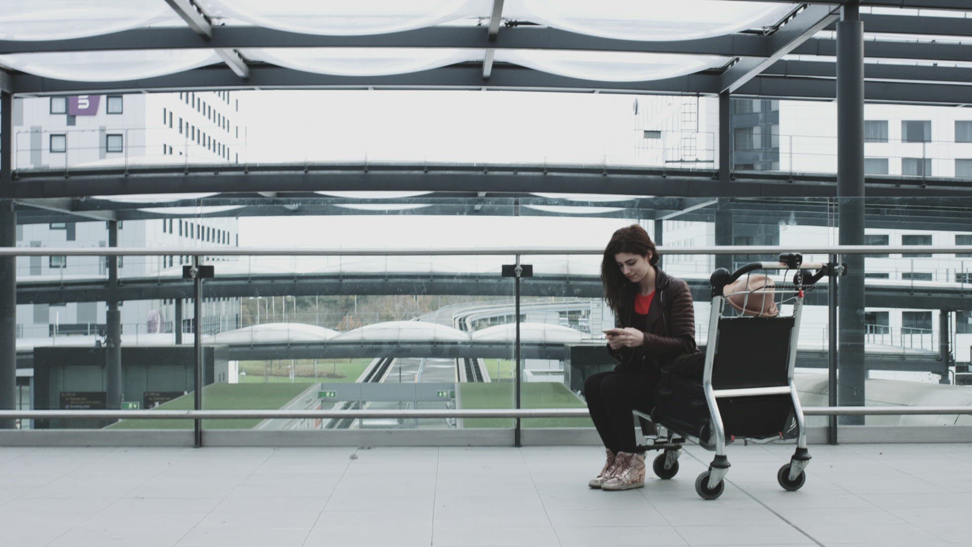 Young Adult Female on smart phone and waiting in airport