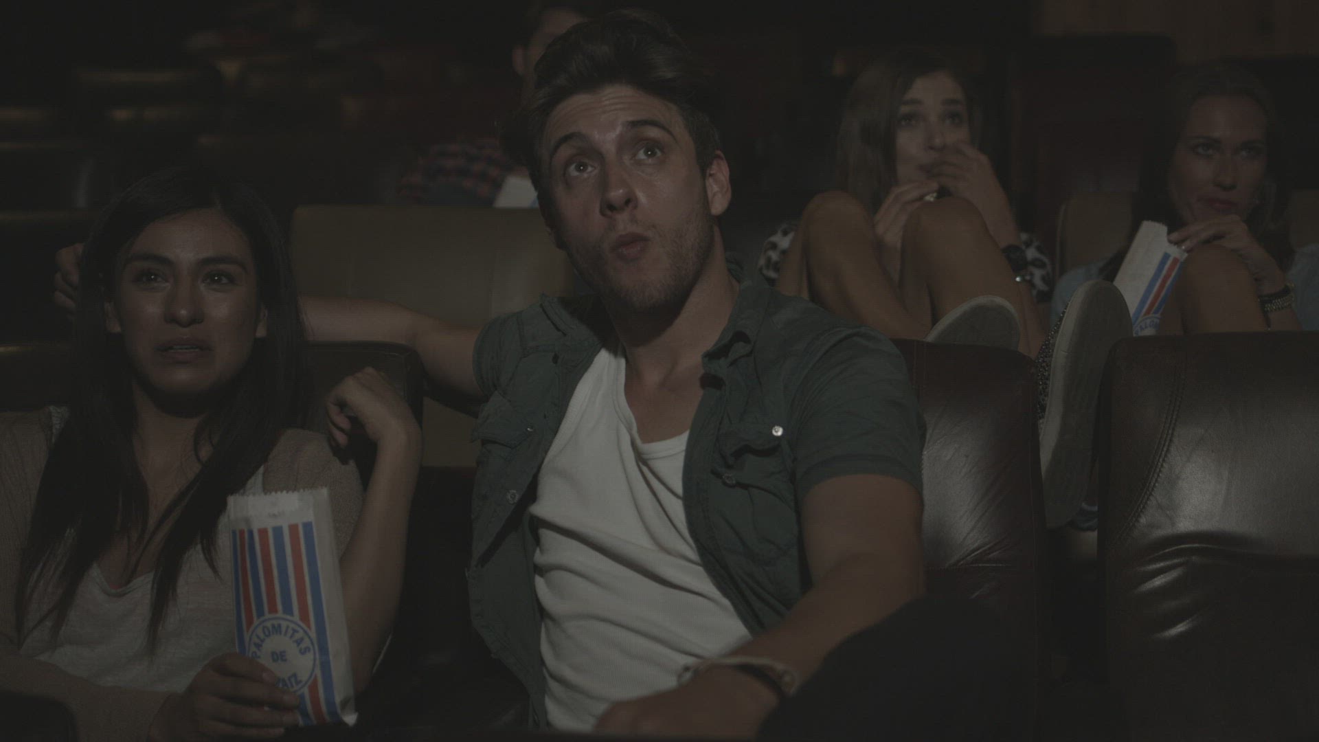 Friends watching cinema and eating popcorn in Movie Theatre