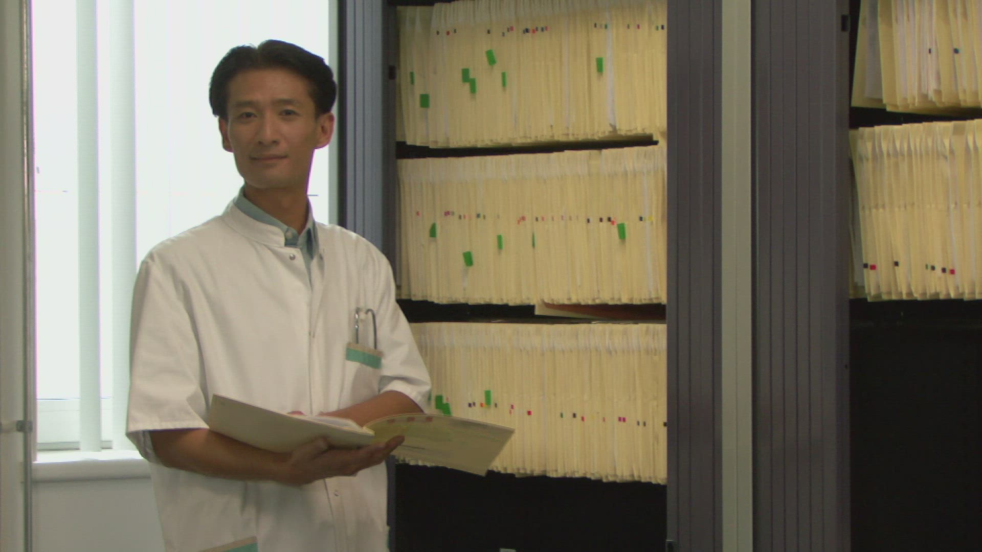 LS PAN OF A DOCTOR READING A FILE AND THEN SITTING AT A COMPUTER