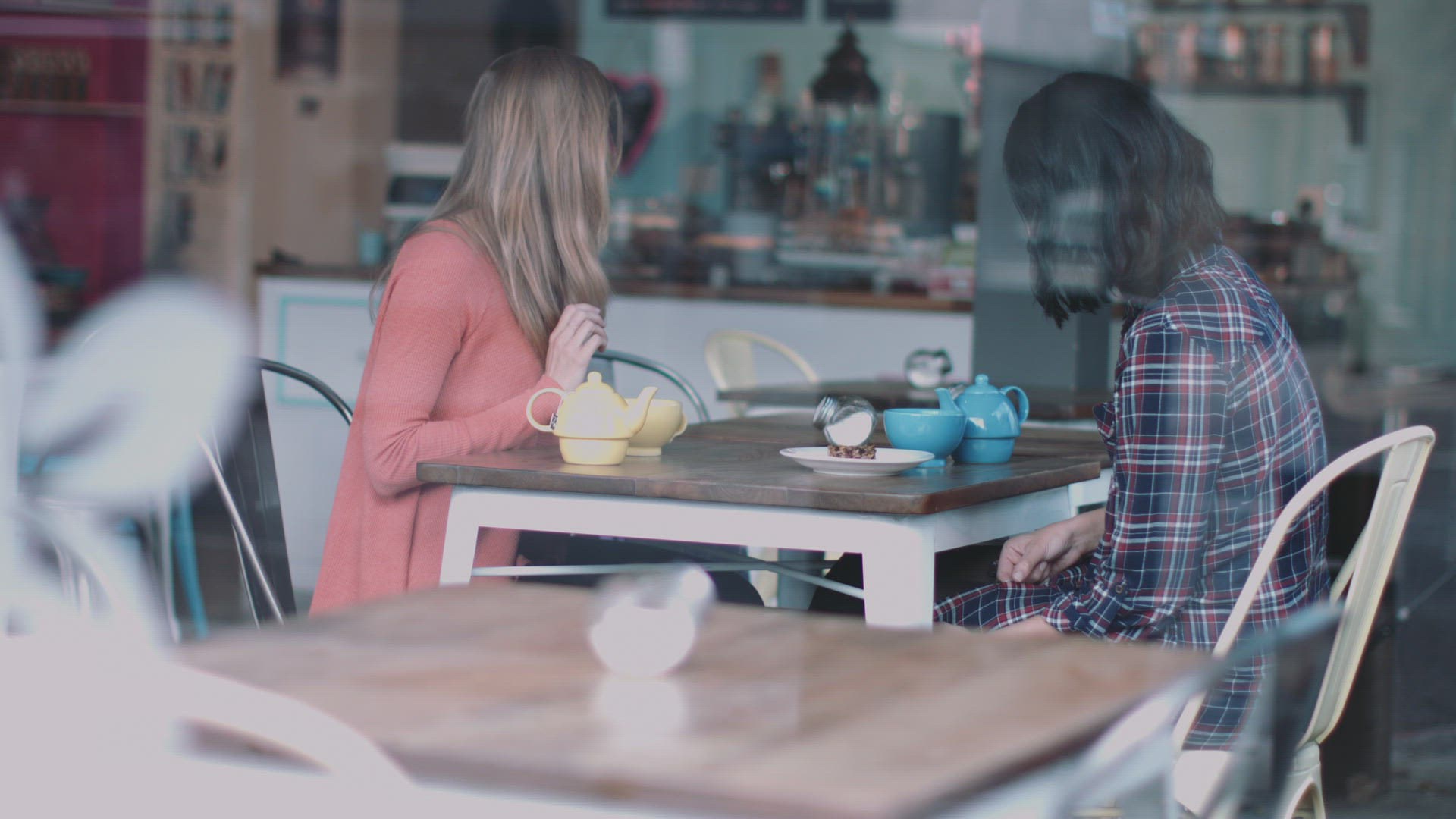 Female friends in coffee shop looking at clothes purchased