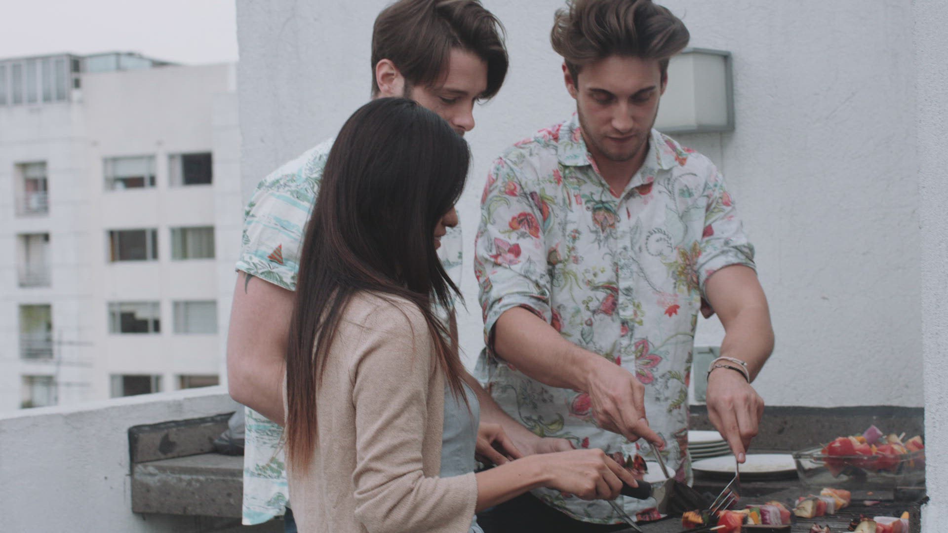 Portrait of friends making funny faces while enjoying on building terrace city in background