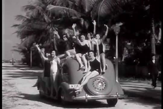 > Chevrolet Leader News excerpt 1936. Bathing girls dive from top of Chevrolet automobile.