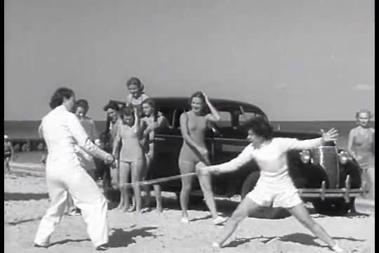 Chevrolet Leader News excerpt 1936. Bathing girls dive from top of Chevrolet automobile.