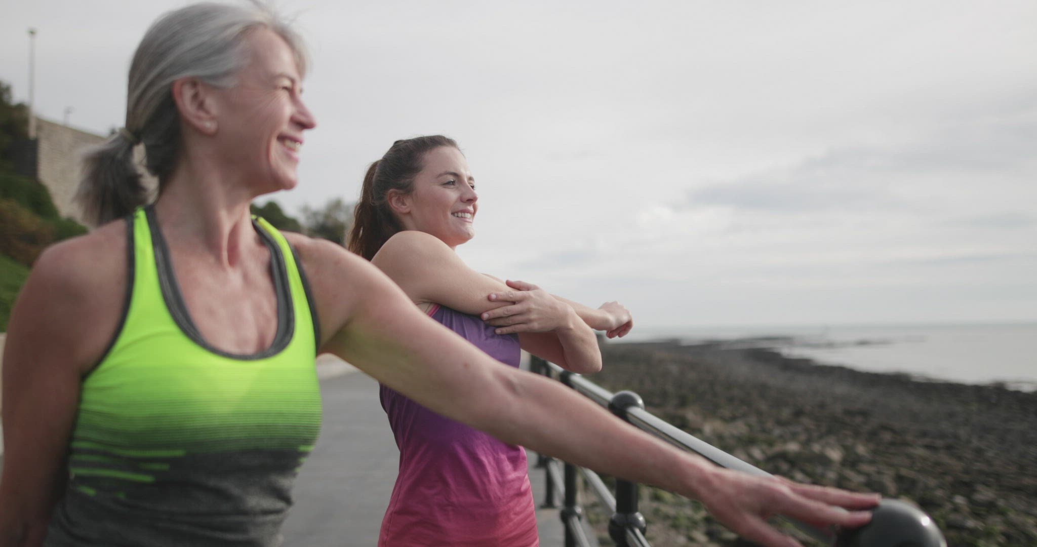 Female fitness model training outside in New York City with skyline and Brooklyn Bridge in background