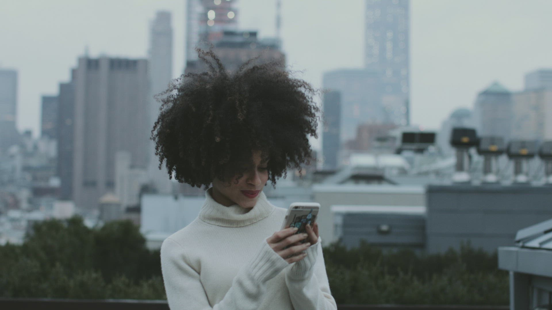 Afro American female on mobile phone on rooftop in Manhattan New York