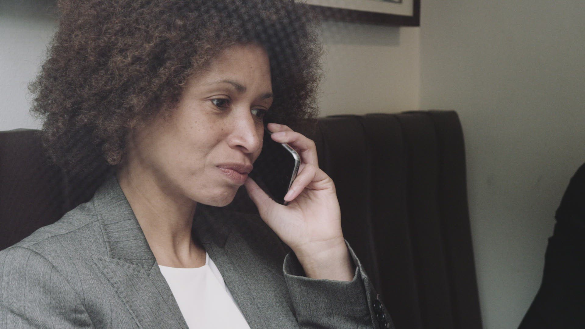 Afro American Businesswoman talking on phone in cafe
