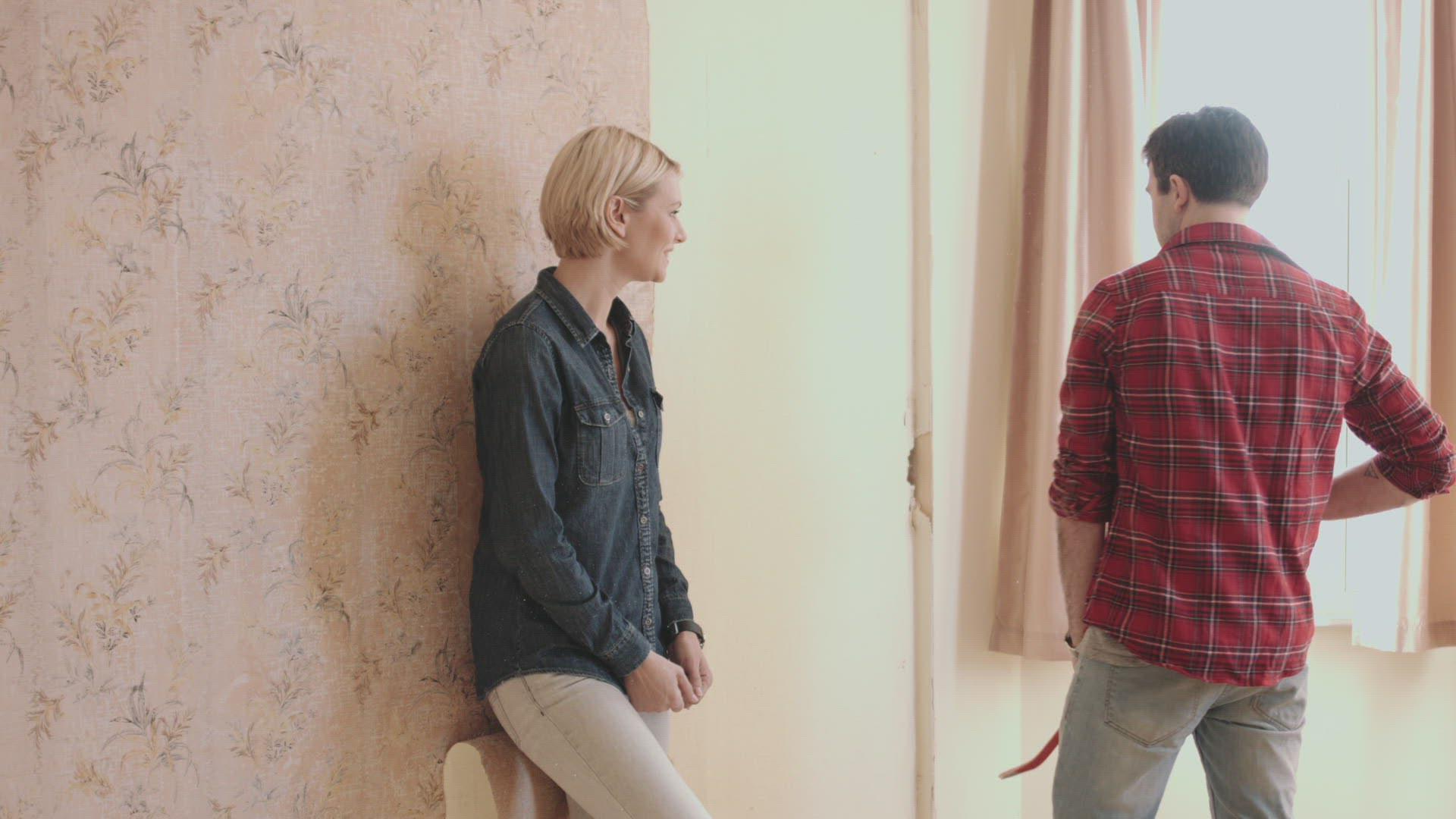 Adult female takes down wall with crowbar; home improvement