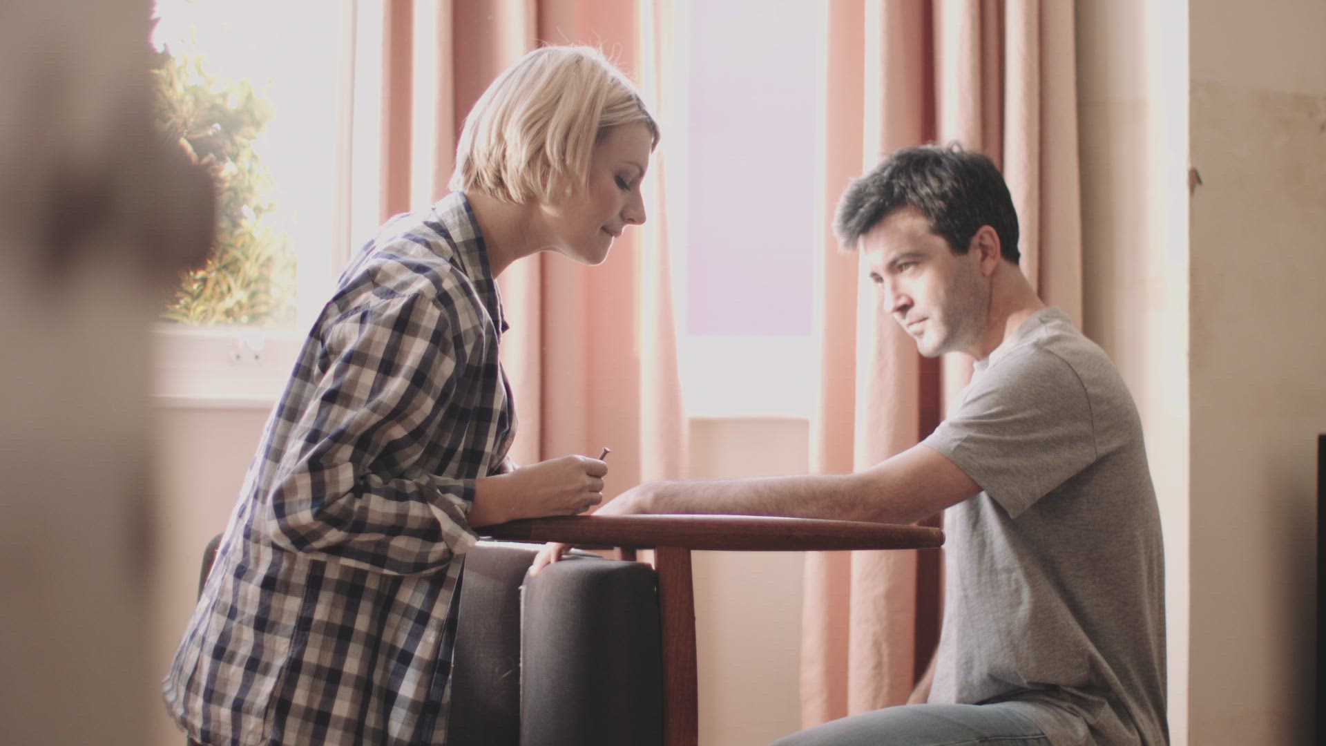 Adult couple home decorating and DIY repairing chair in living room