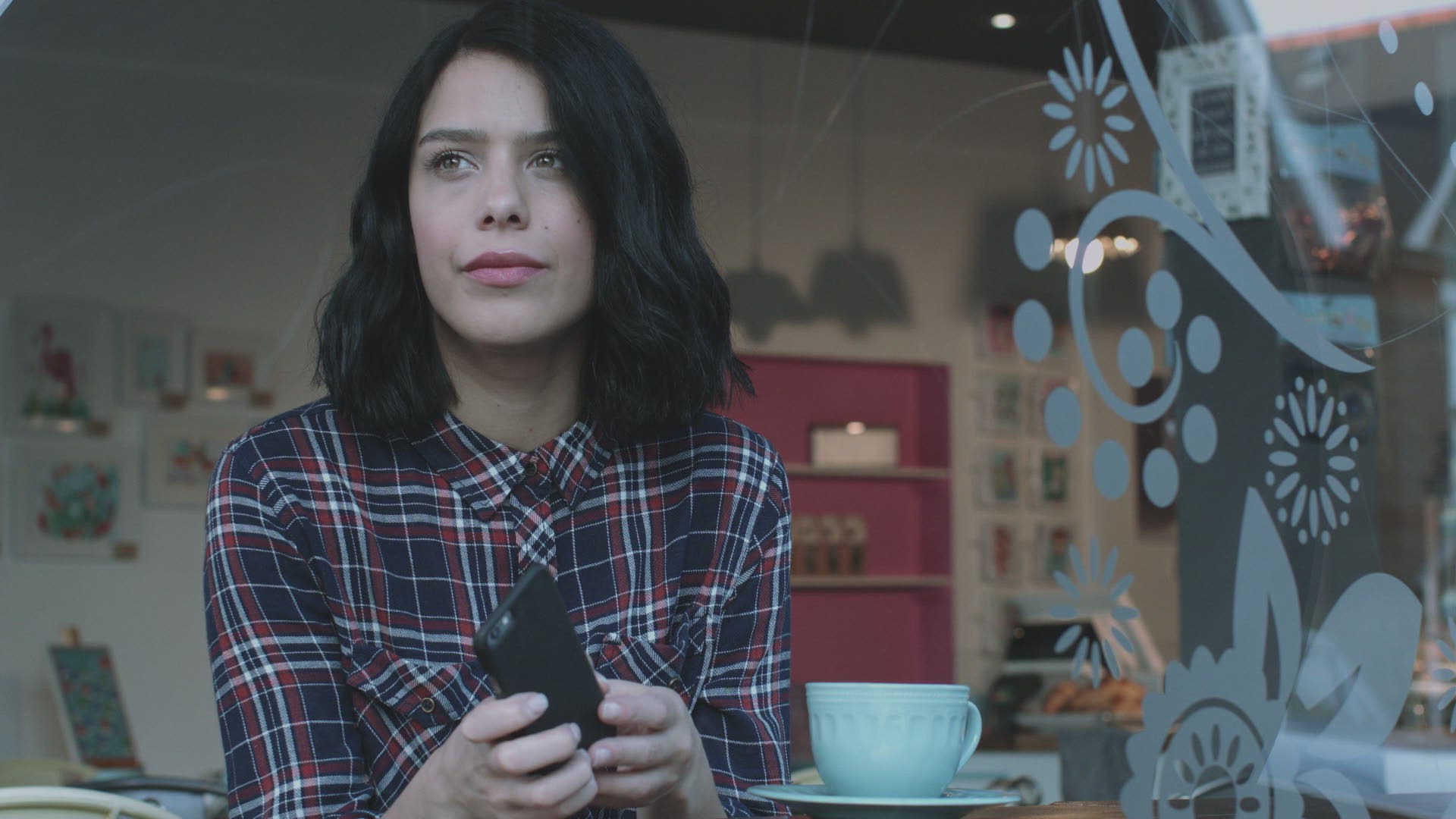 Japanese woman in drinking green tea and using smart phone. Tokyo; Japan