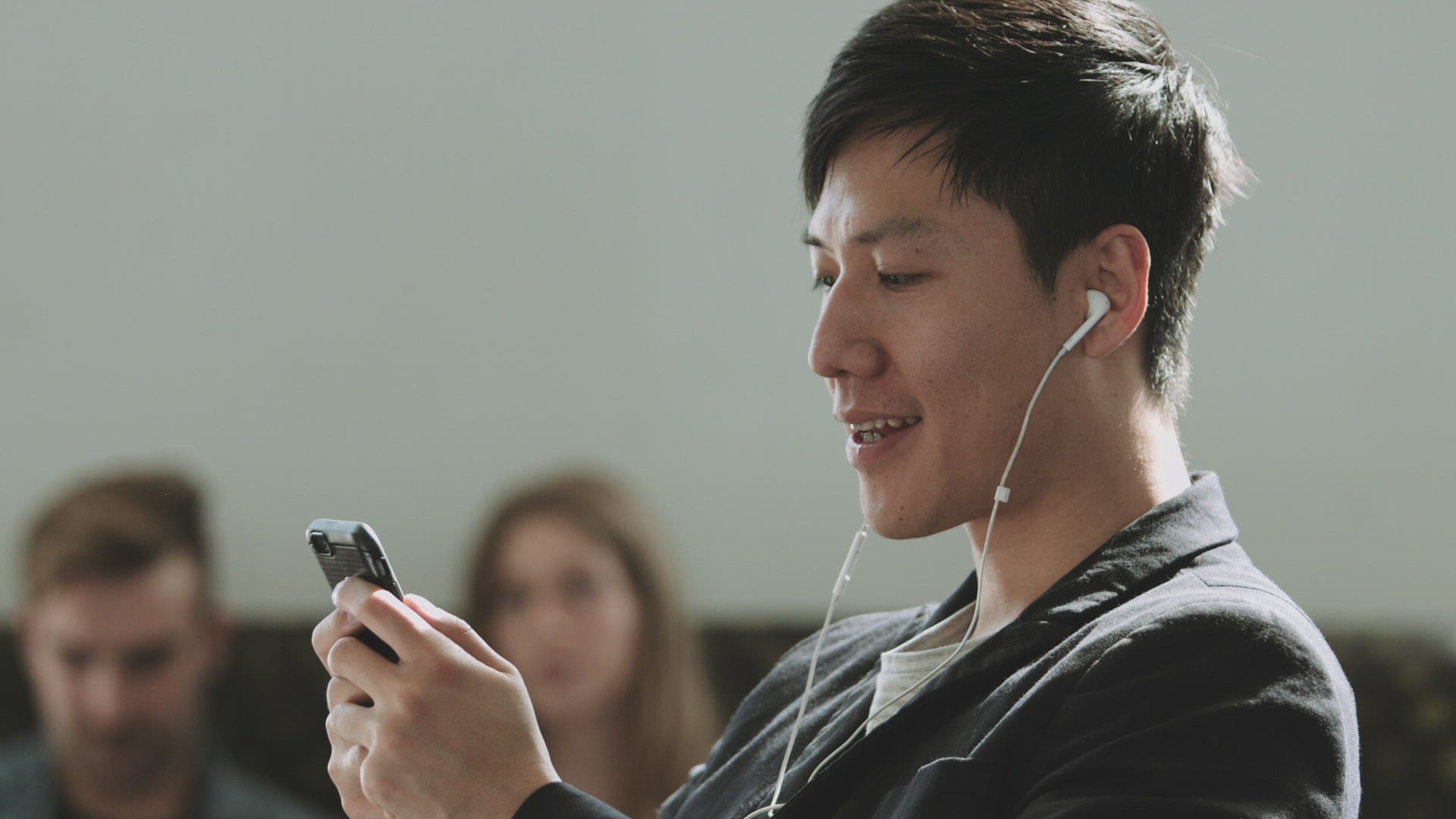 Asian Male speaking on mobile phone whilst waiting in airport lounge