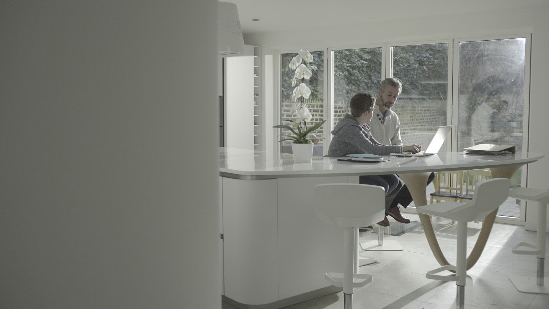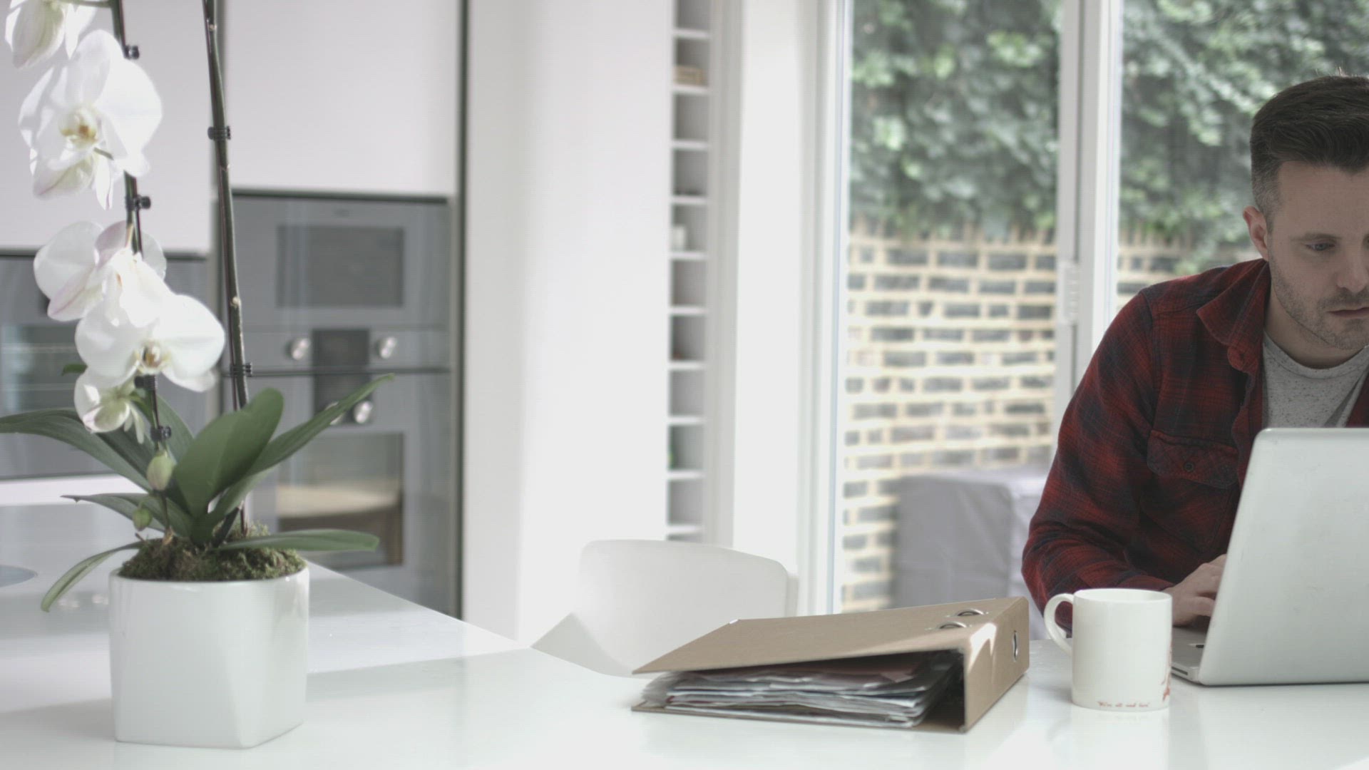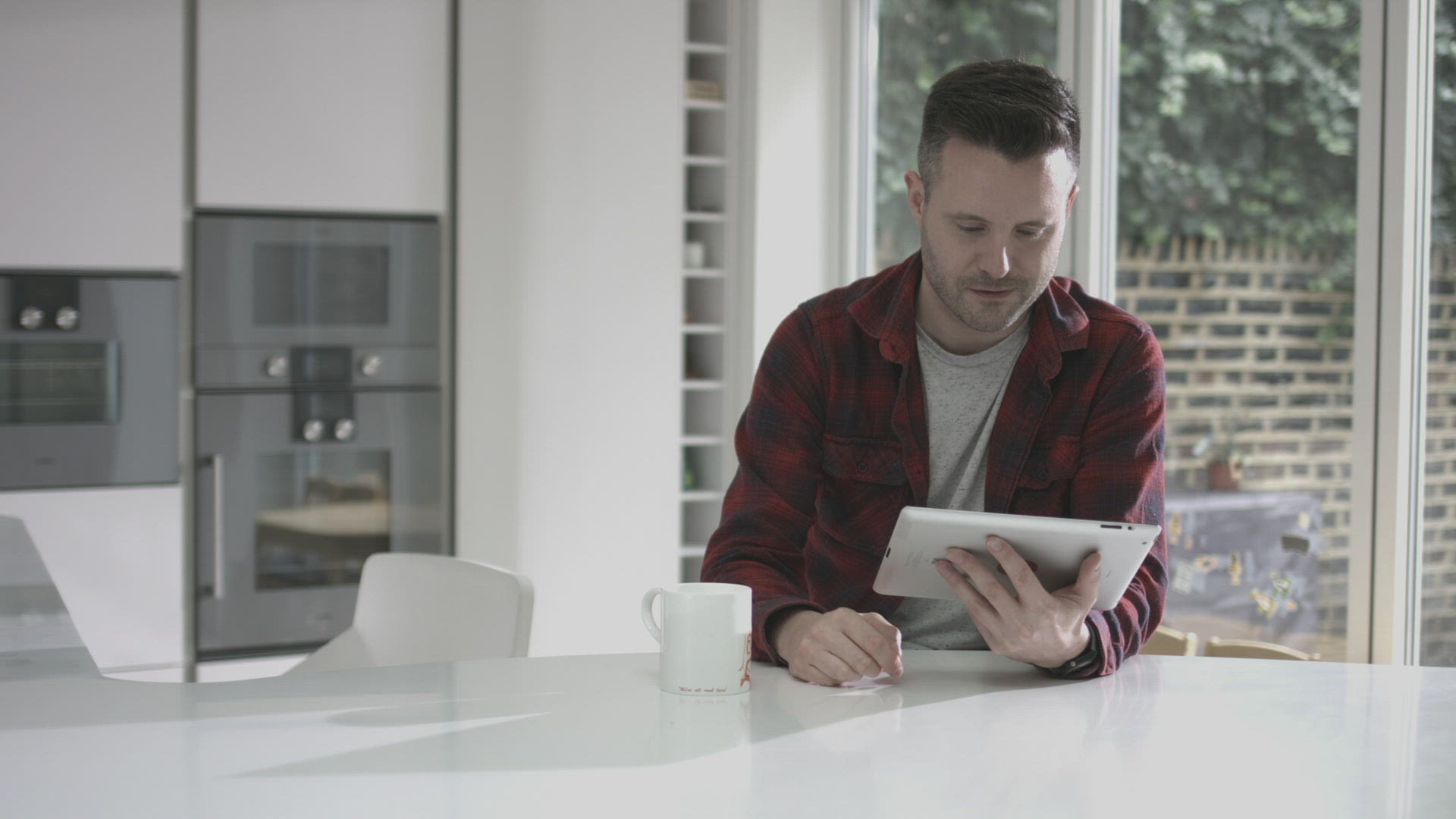 Same sex couple watching laptop and drinking coffee in kitchen