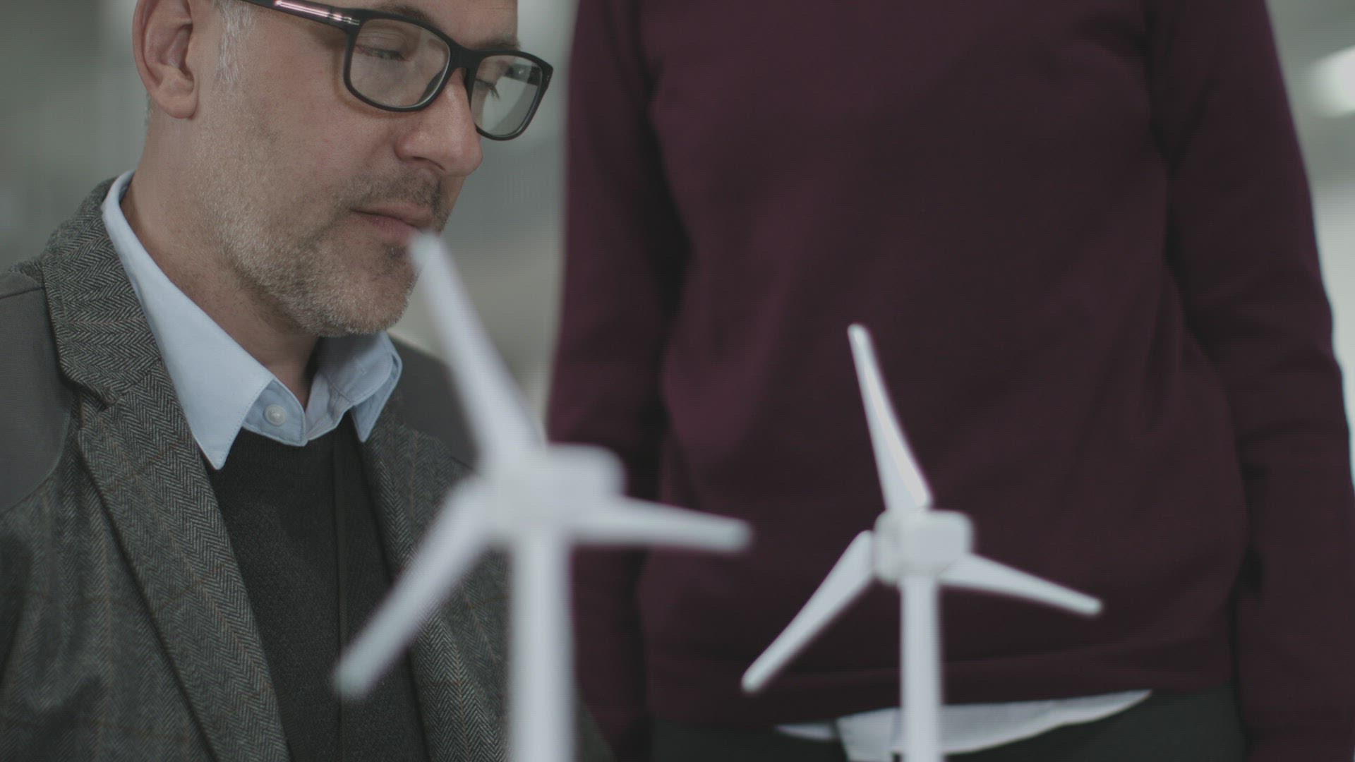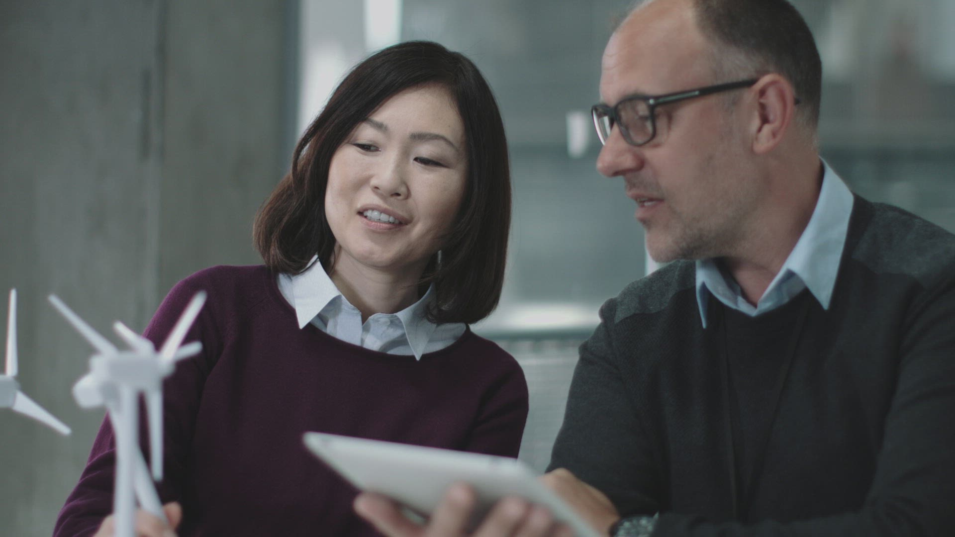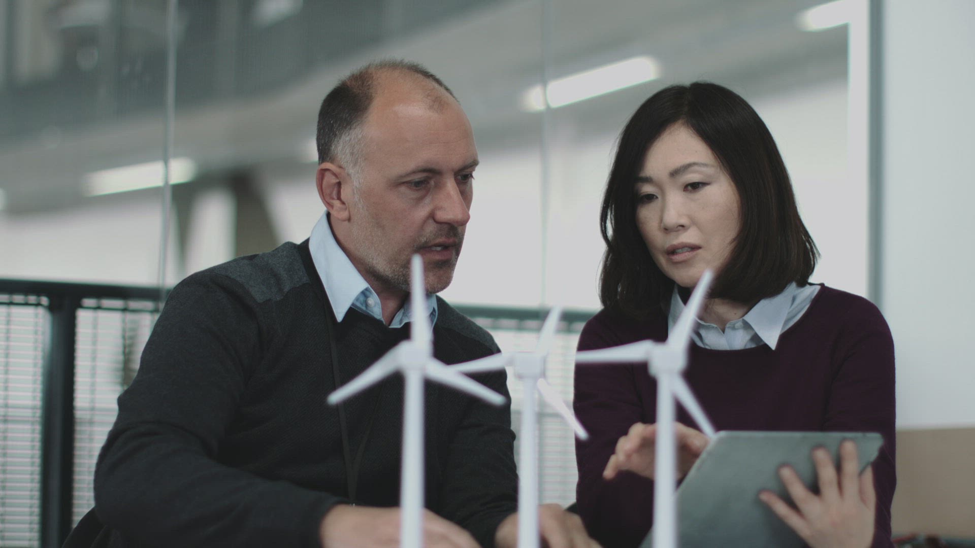 Business people examining wind turbine models in office