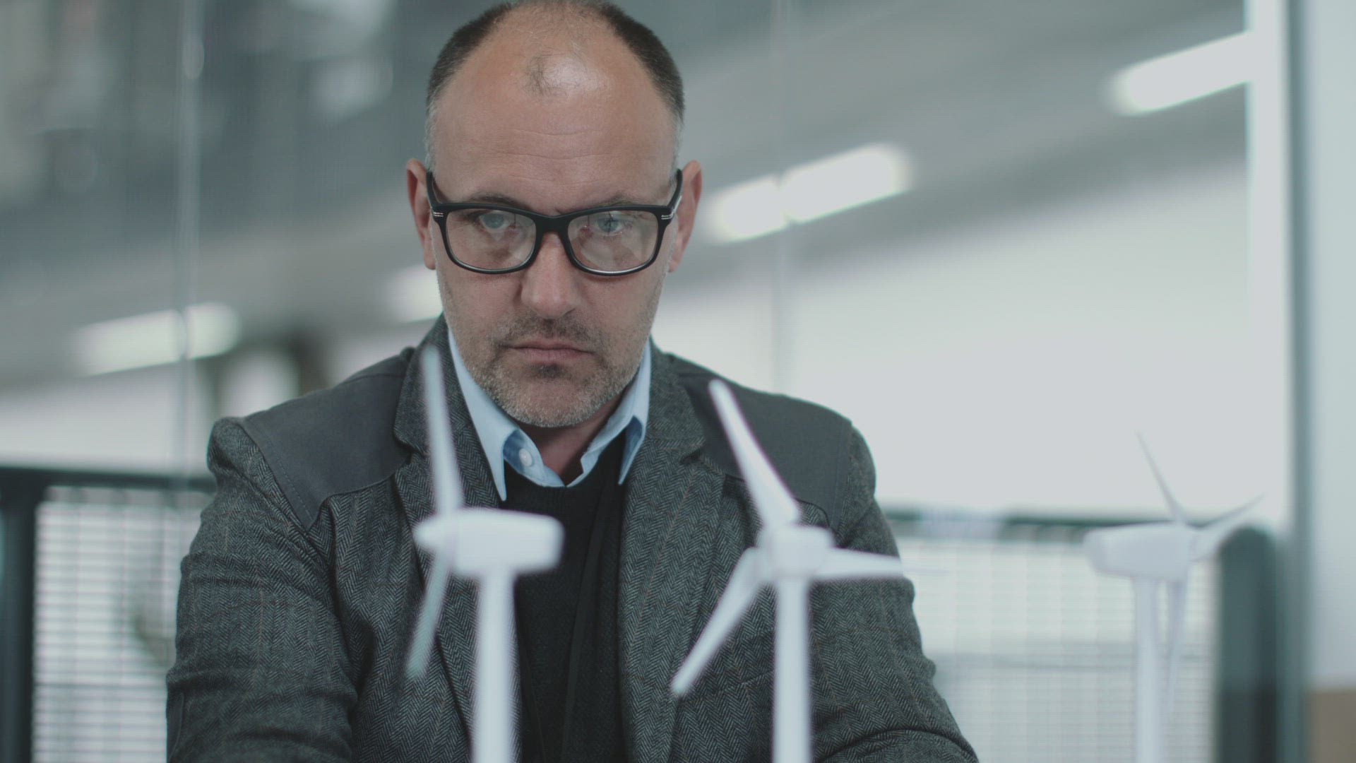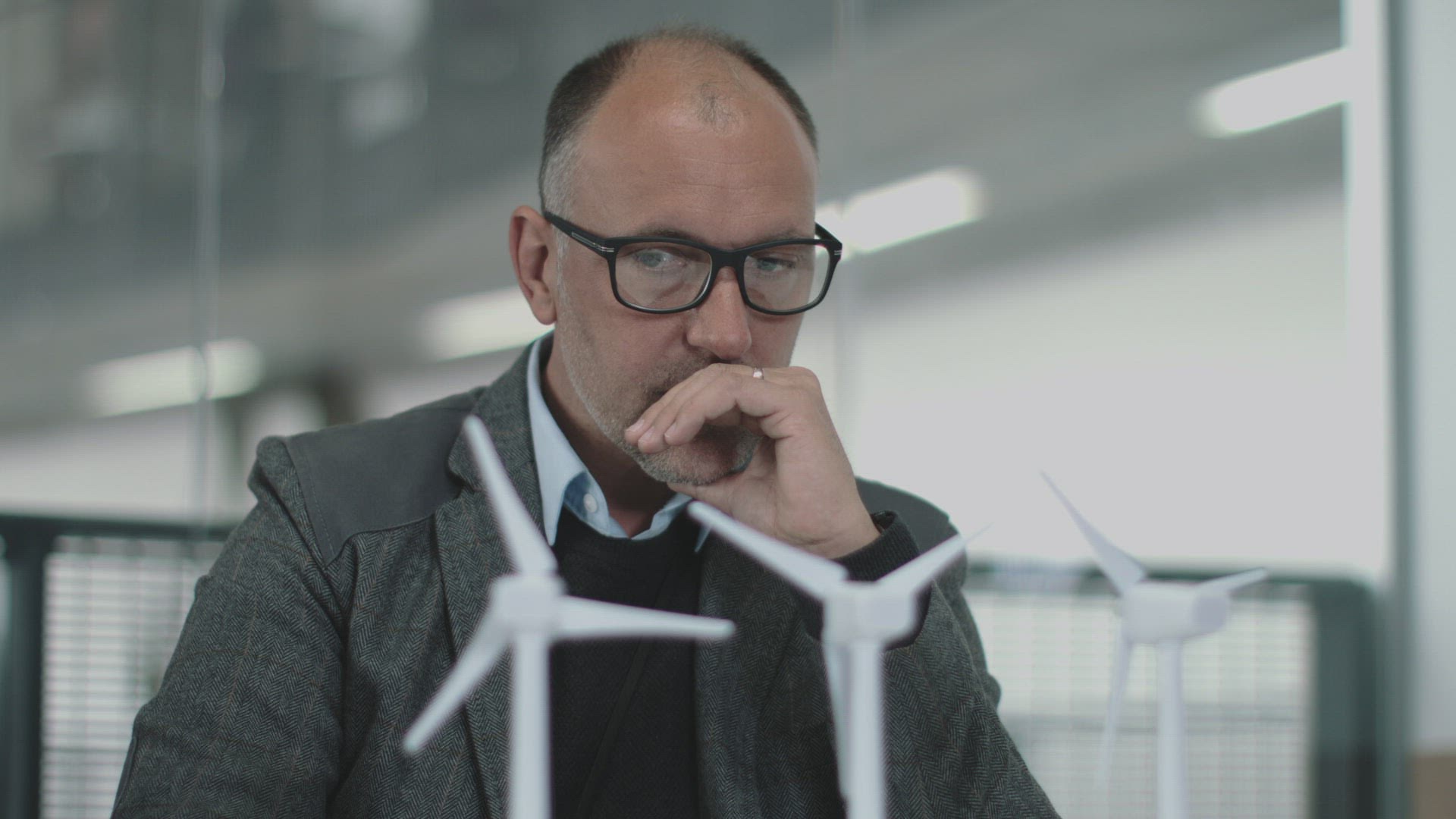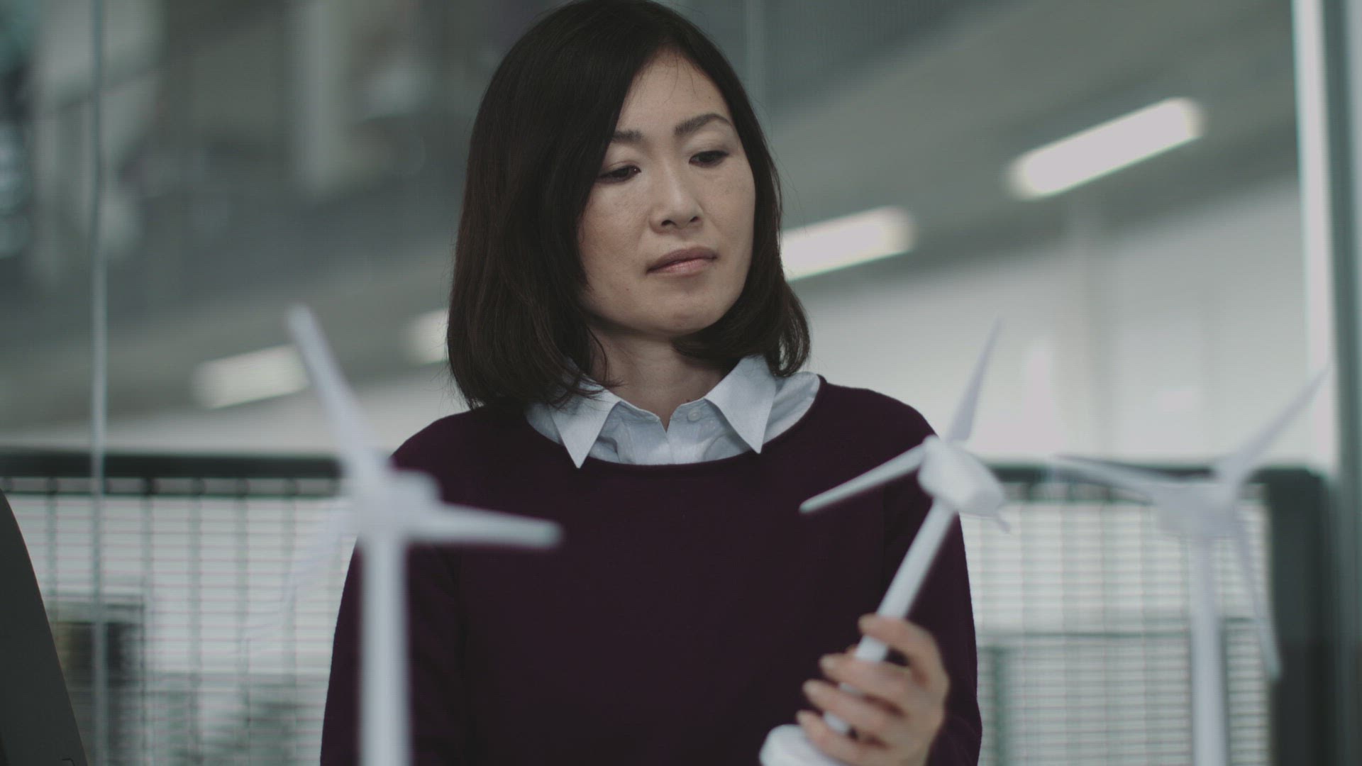 Business people examining wind turbine models in office