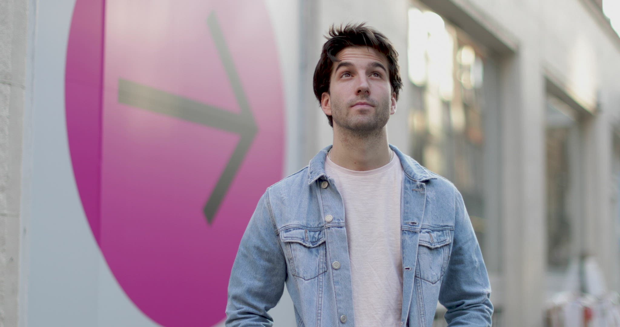 Portrait of young adult female with arrow sign in background