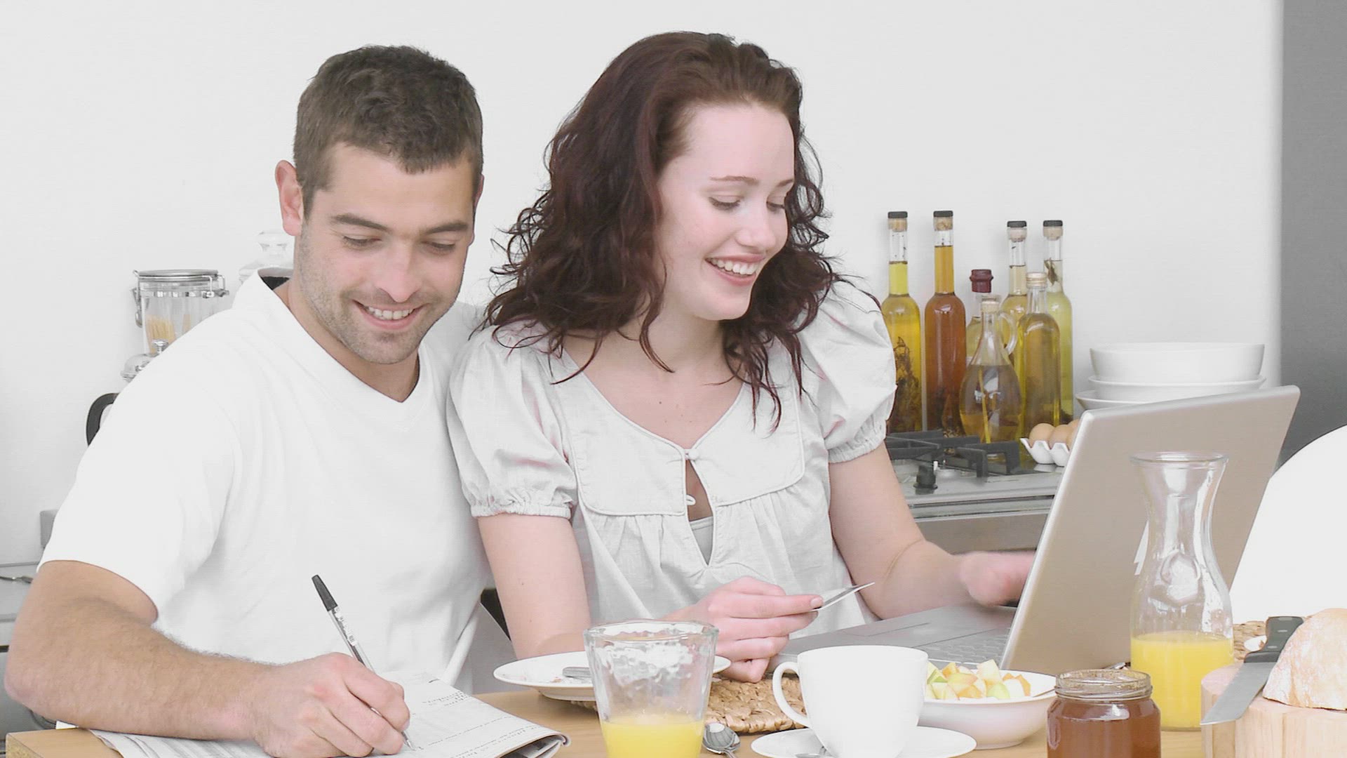 Panorama of family having breakfast and using a laptop in the kitchen